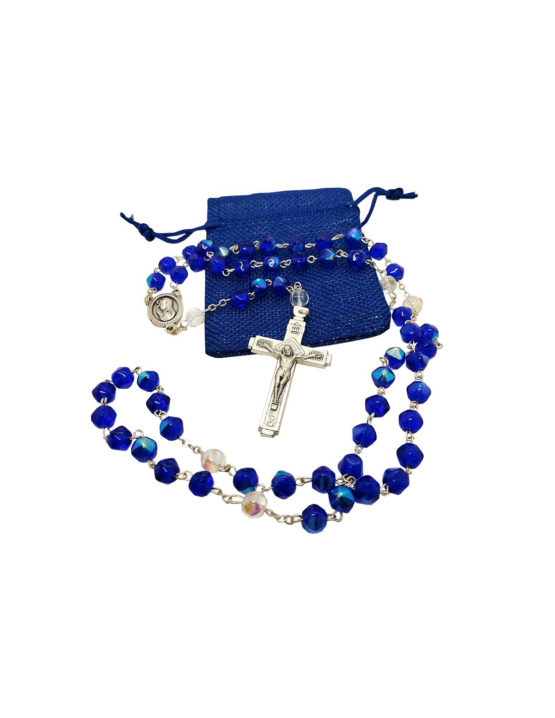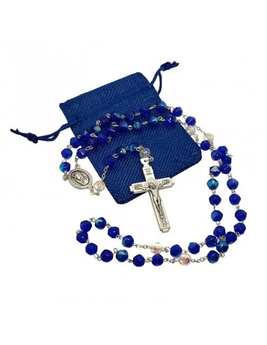 Rosario con cuentas de vidrio facetadas de color azul real, montado sobre una cadena de metal plateado. La medalla lleva en relieve el rostro de la Santísima Virgen y un Ave María.