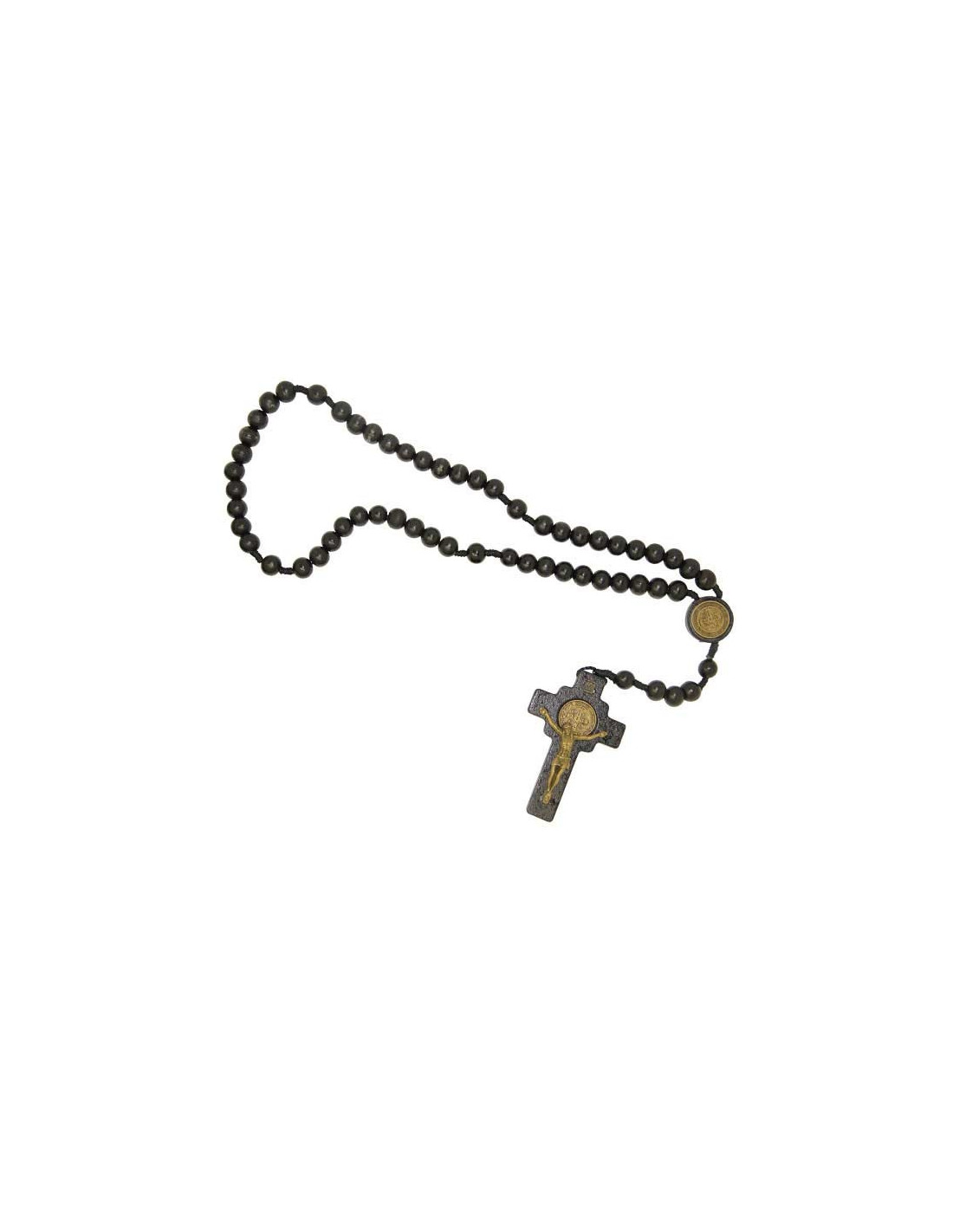Este rosario de San Benito en madera negra, montado sobre cuerda resistente, es un objeto de devoción recomendado para alejar a las malas personas y protegerse contra el mal.
