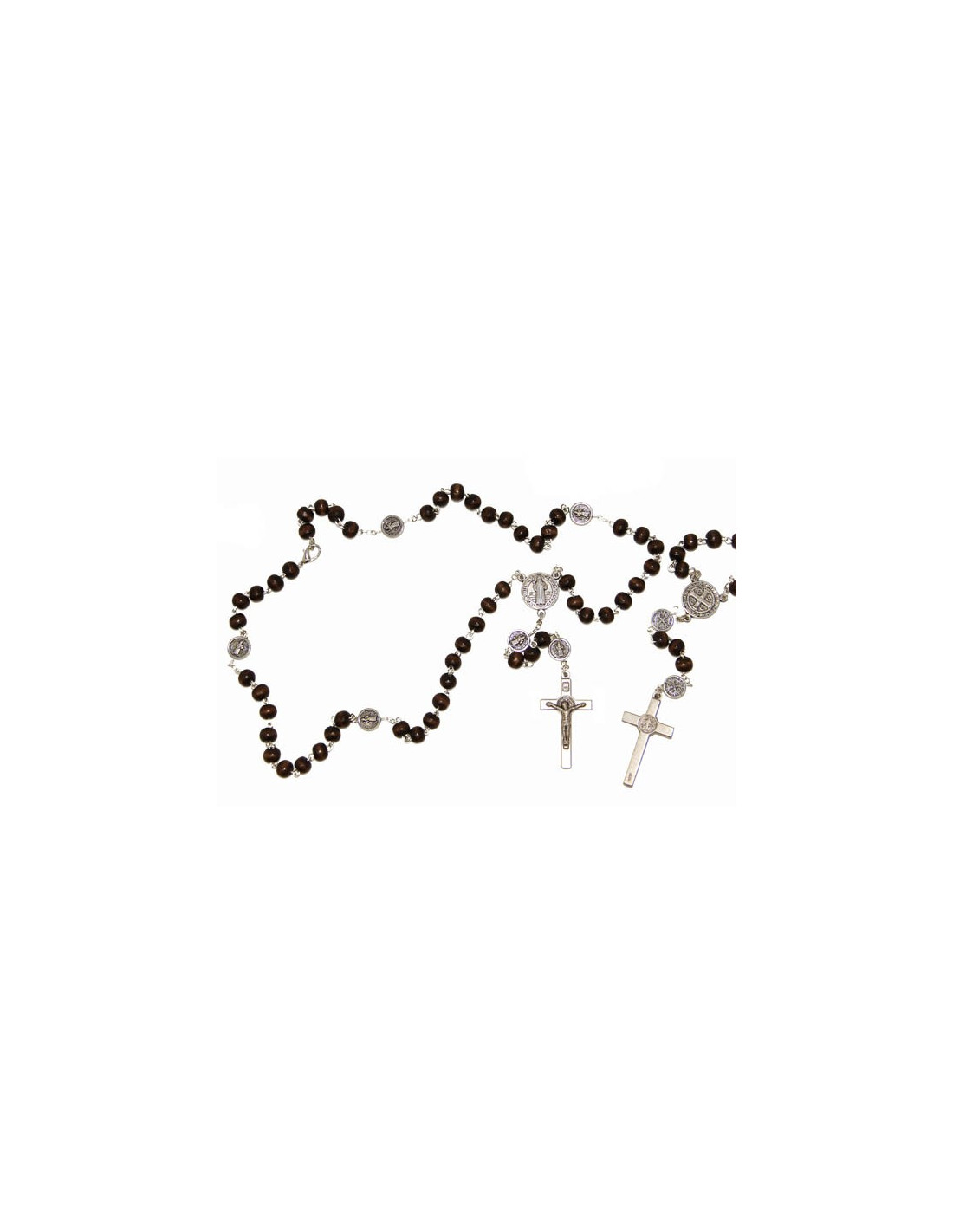 Rosario de cuentas de madera sobre cadena de metal plateado
