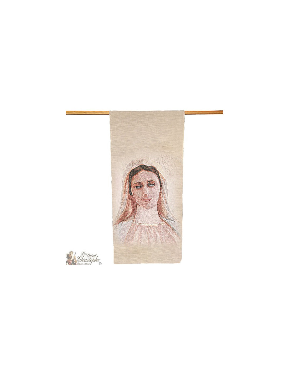 Tapiz de pared bordado con la imagen de la Virgen María de Medjugorje. Está bellamente terminado y hecho a mano en el estilo de los tapices de Brujas. El reverso del tapiz también se teje para que no se vea el reverso de las costuras, dejando un fondo liso de color crema.