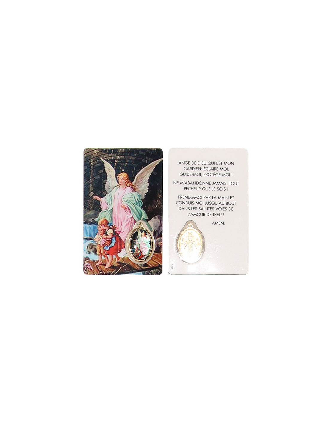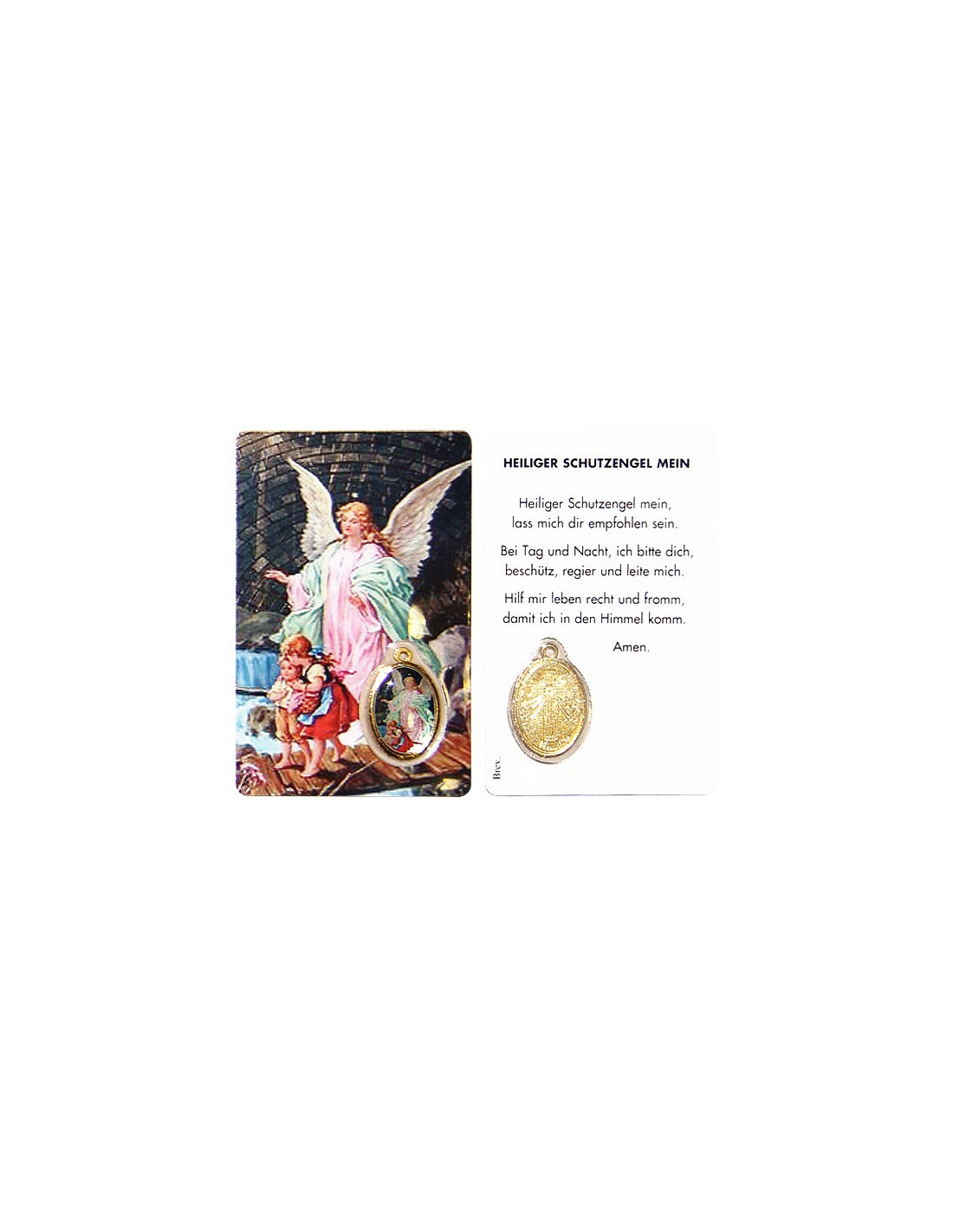 Esta medalla-tarjeta honra al Ángel de la Guarda. La tarjeta lleva impresa una pintura del Ángel de la Guarda y una oración en su nombre, y puede llevarse en el bolsillo o en la cartera. Está decorada con una medalla sagrada, que puedes recortar para llevarla como colgante o dejarla con la tarjeta como recuerdo.