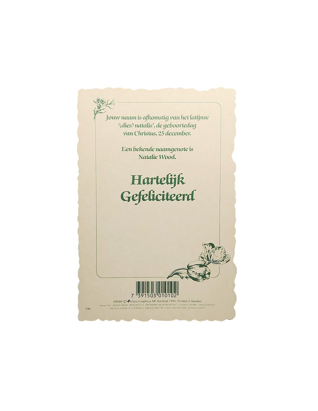 Esta postal personalizada presenta un nombre de pila, su significado etimológico y algunos personajes famosos que lo llevan. Impresa en cartulina de alta calidad con un elegante troquelado, está adornada con un colorido marco floral de estilo vintage. Perfecto como regalo sencillo y original para un cumpleaños, un bautizo o un mensaje simbólico. Una forma estupenda de hacer un guiño a la identidad de un ser querido.