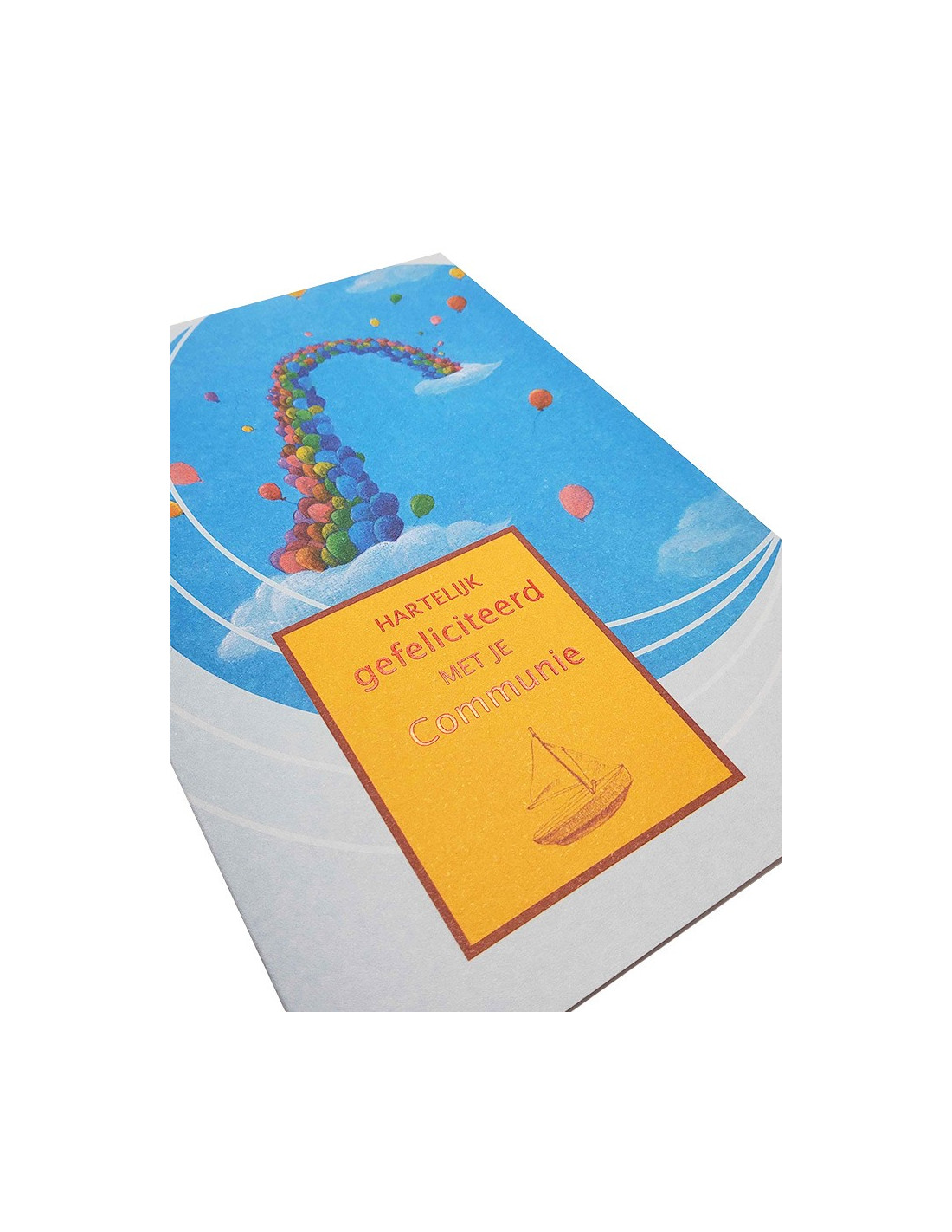 Felicite a un niño por su comunión con esta tarjeta de felicitación. Con su ilustración de un arcoíris de globos multicolores en un magnífico cielo azul, es un símbolo de conexión con el Señor y la comunidad cristiana, al tiempo que mantiene un espíritu festivo y acogedor. El interior de la tarjeta está en blanco, para que dé rienda suelta a su imaginación y escriba una dedicatoria personalizada al joven comulgante. La tarjeta se suministra con un sobre a juego. El texto es en rojo metalizado brillante, solo en neerlandés.