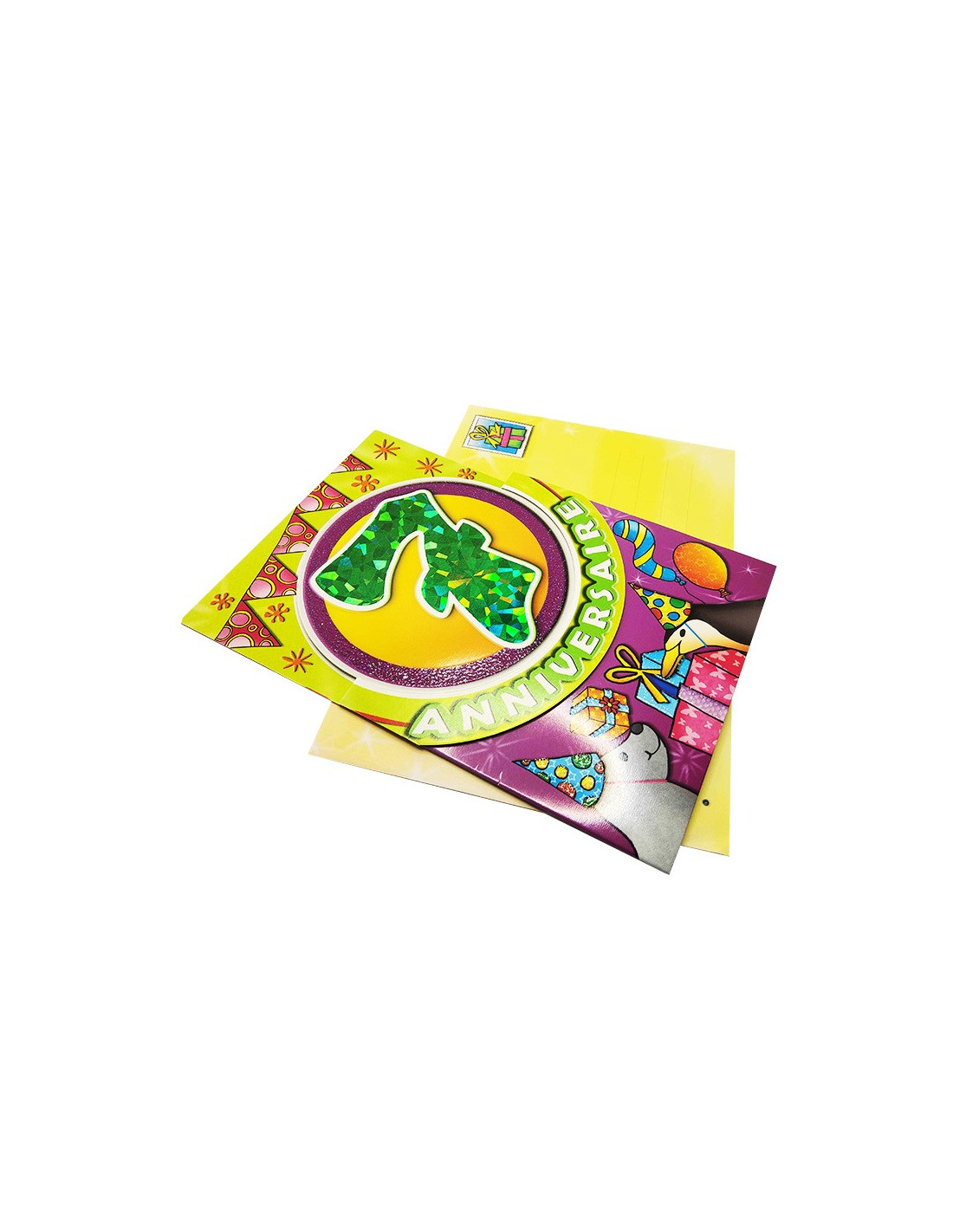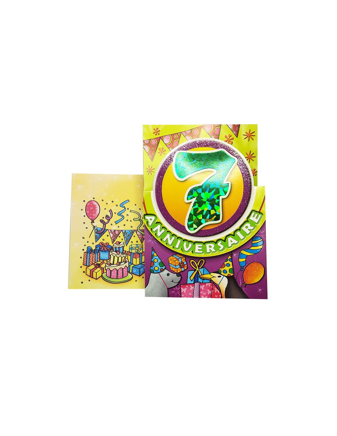 Celebra los 7 años de un niño con esta tarjeta de cumpleaños. Celebra este acontecimiento con un estilo retro gracias a esta tarjeta de felicitación adornada con purpurina y un efecto brillante. El corte de la tarjeta es original y destaca el número de años que se celebran. Acompañada de un pequeño texto cariñoso en el interior, también tiene espacio para escribir unas palabras más personales. La tarjeta se suministra con un sobre a juego. El texto está solo en francés.