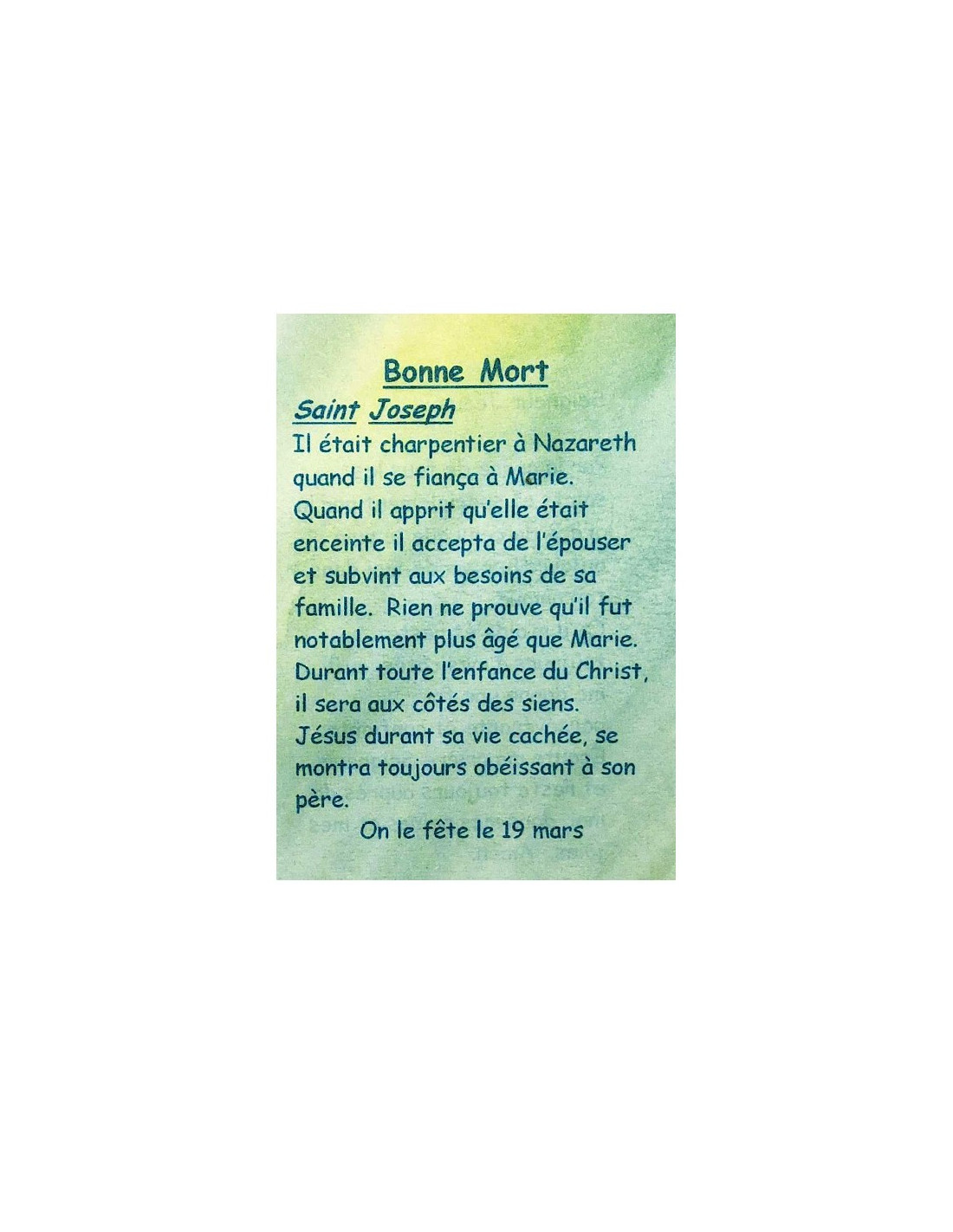 Esta tarjeta es una pequeña herramienta discreta para rezar a sus santos patronos. Está dirigida a las personas que desean una buena muerte o la desean para sus seres queridos. La tarjeta explica en pocas palabras quién es su santo patrón: San José. En el reverso hay escrita una breve oración dedicada a Jesús y a la gracia de los santos patronos para reconfortar en el esfuerzo, fortalecer la fe, superar los obstáculos y proteger de los males cotidianos.