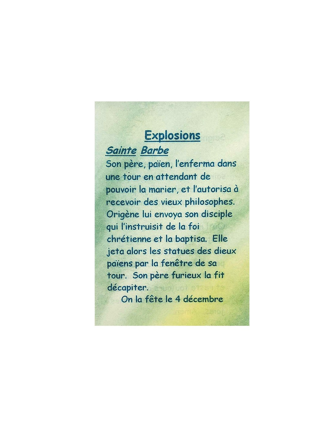 Esta tarjeta es una pequeña herramienta discreta para rezar a sus santos patronos. Está dirigida a todos, ya que es una oración para las explosiones. La tarjeta explica en pocas palabras quién es la santa patrona: Santa Bárbara. En el reverso hay escrita una breve oración dedicada a Jesús y a la gracia de los santos patronos para reconfortar en el esfuerzo, fortalecer la fe, superar los obstáculos y proteger de los males cotidianos.