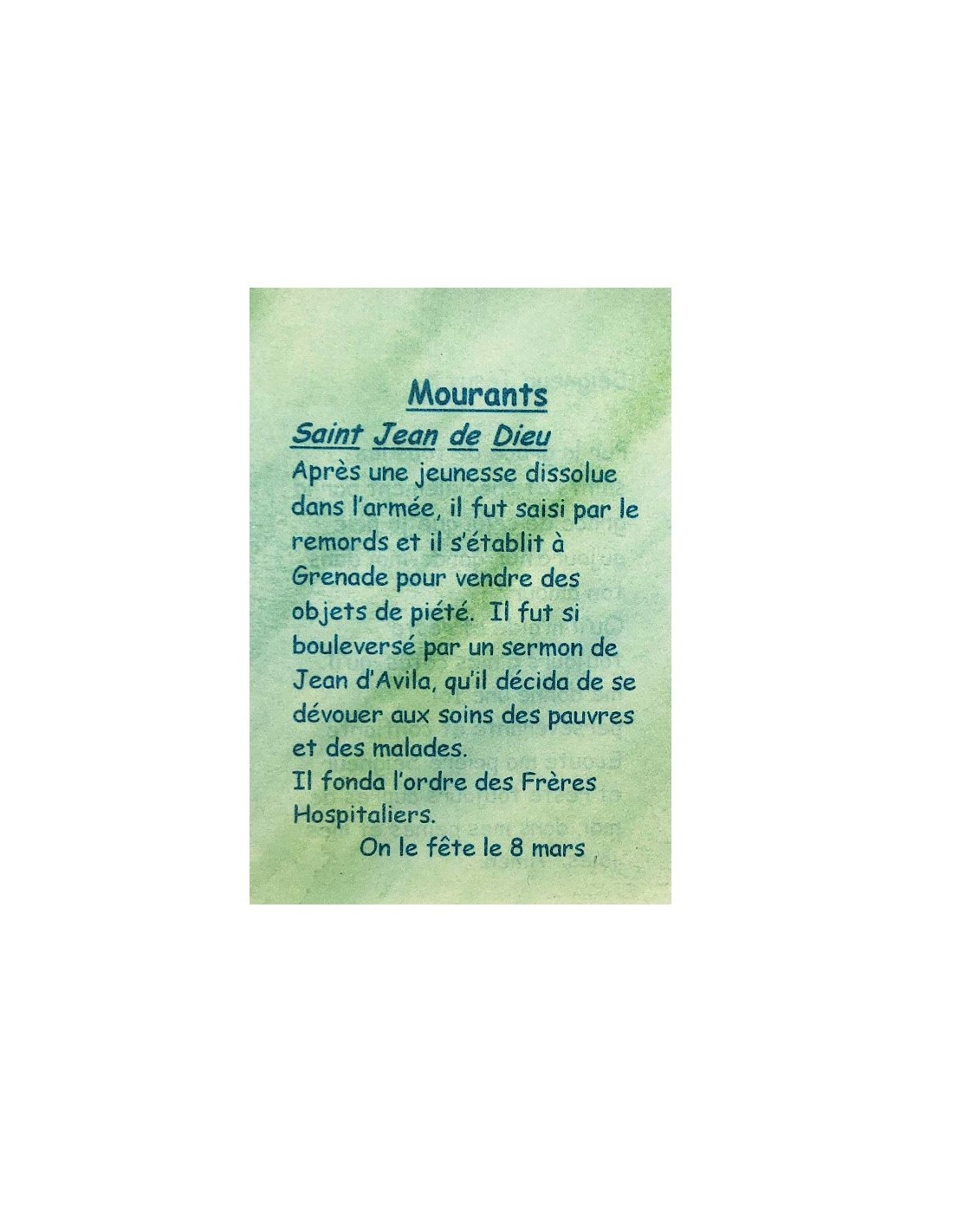 Esta tarjeta es una pequeña herramienta discreta para rezar a sus santos patronos. Está dirigida a todos, ya que es una oración para los moribundos. La tarjeta explica en pocas palabras quién es el santo patrón: San Juan de Dios. En el reverso hay escrita una breve oración dedicada a Jesús y a la gracia de los santos patronos para reconfortar en el esfuerzo, fortalecer la fe, superar los obstáculos y proteger de los males cotidianos.