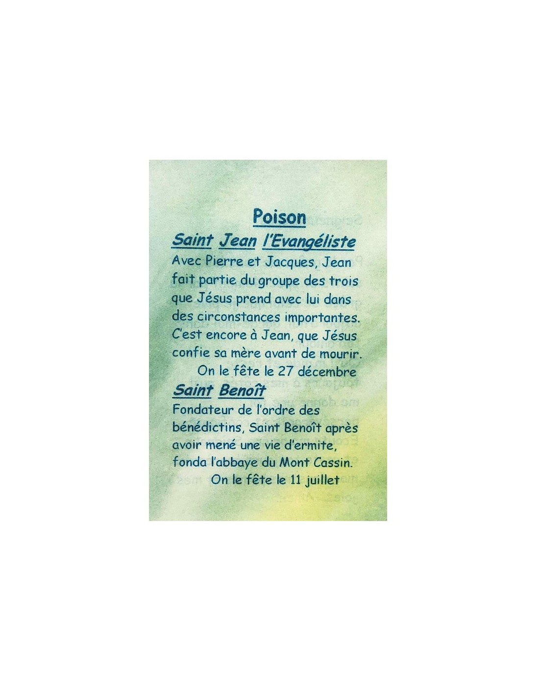 Questa carta è un piccolo strumento discreto per pregare i vostri santi patroni. È rivolta a tutti perché è una preghiera contro il veleno. La cartolina spiega in poche parole chi sono i santi patroni: San Giovanni Evangelista e San Benedetto. Sul retro è scritta una breve preghiera dedicata a Gesù e alla grazia dei santi patroni per confortare negli sforzi, rafforzare nella fede, superare gli ostacoli e proteggere dai mali quotidiani.