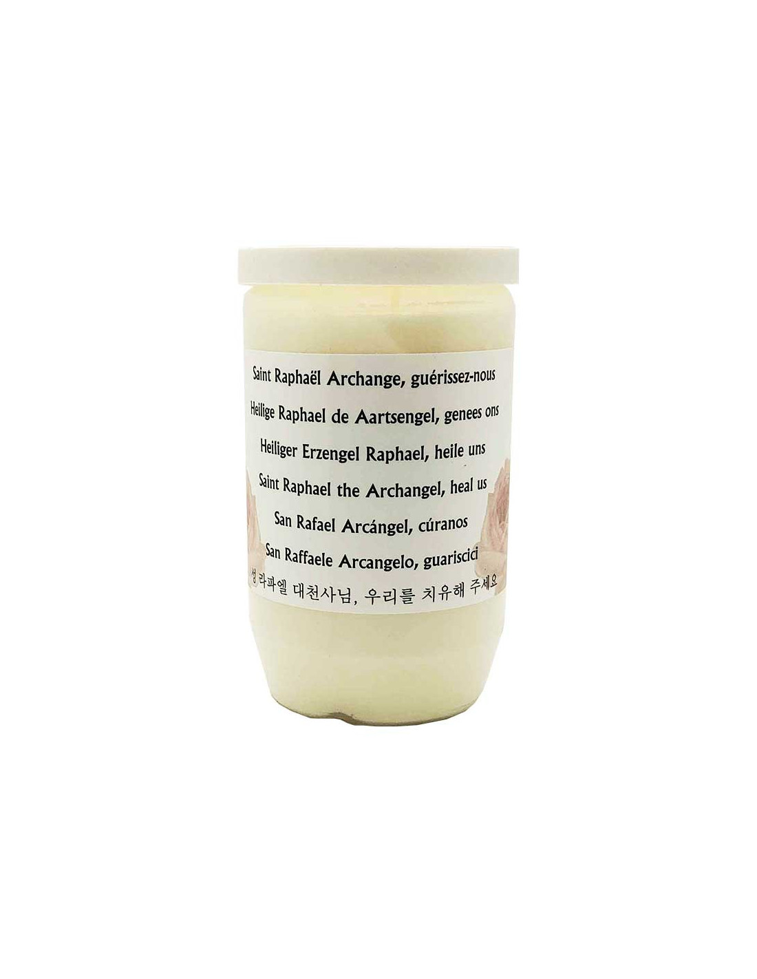 Esta vela votiva de aceite, dedicada a San Rafael, arcángel de la sanación y la protección, simboliza la salud, la guía y el cuidado divino.