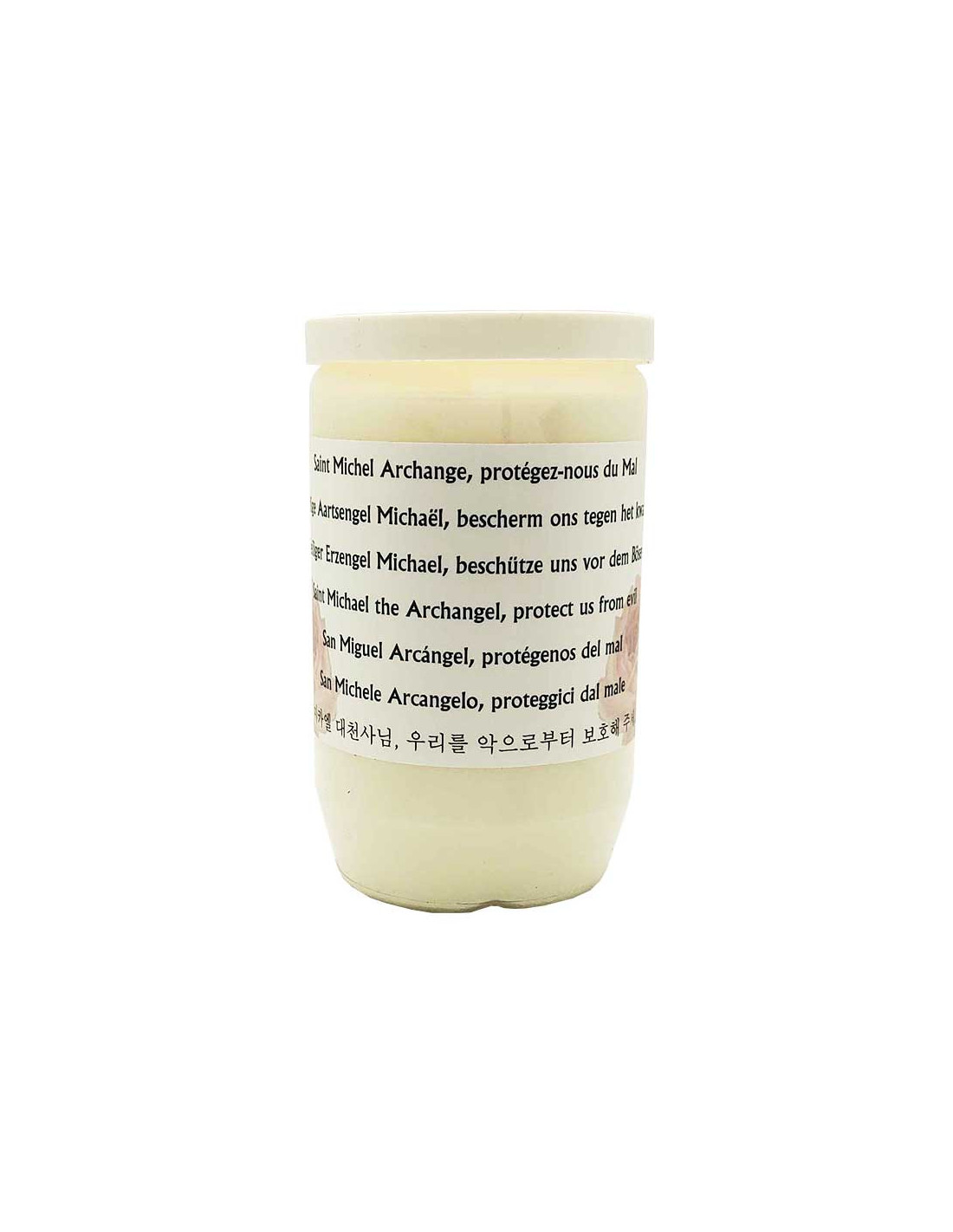Esta vela votiva de aceite, dedicada a San Miguel Arcángel, simboliza la protección, la justicia y la defensa espiritual.