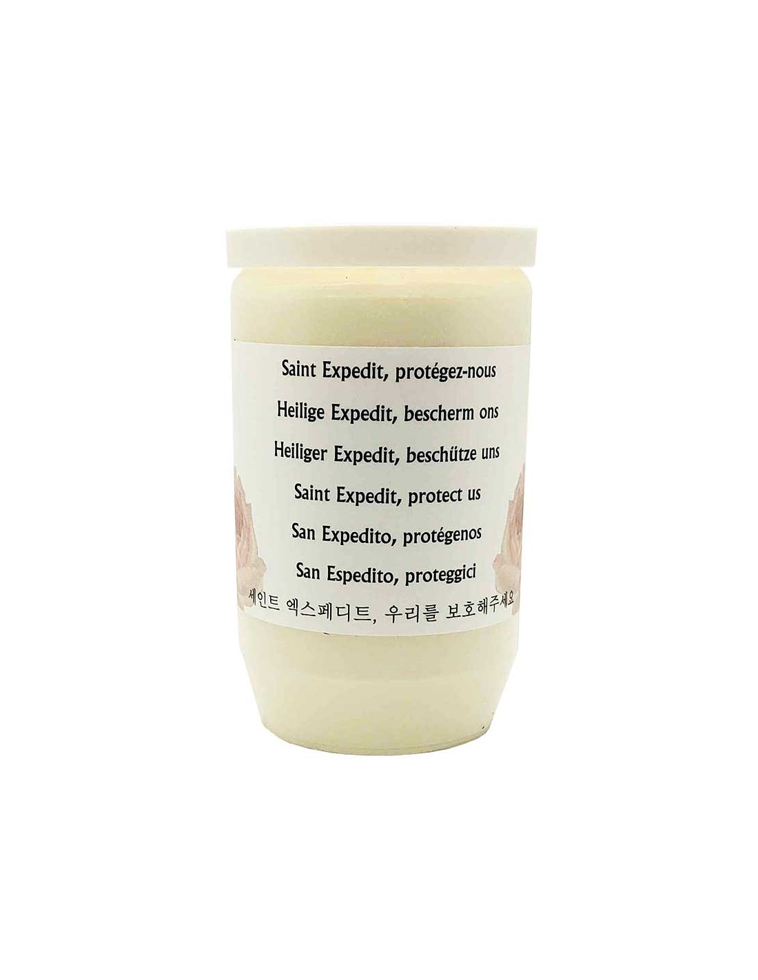 Esta vela votiva de aceite, dedicada a San Expedito, simboliza la rapidez, la decisión y la ayuda en situaciones urgentes.