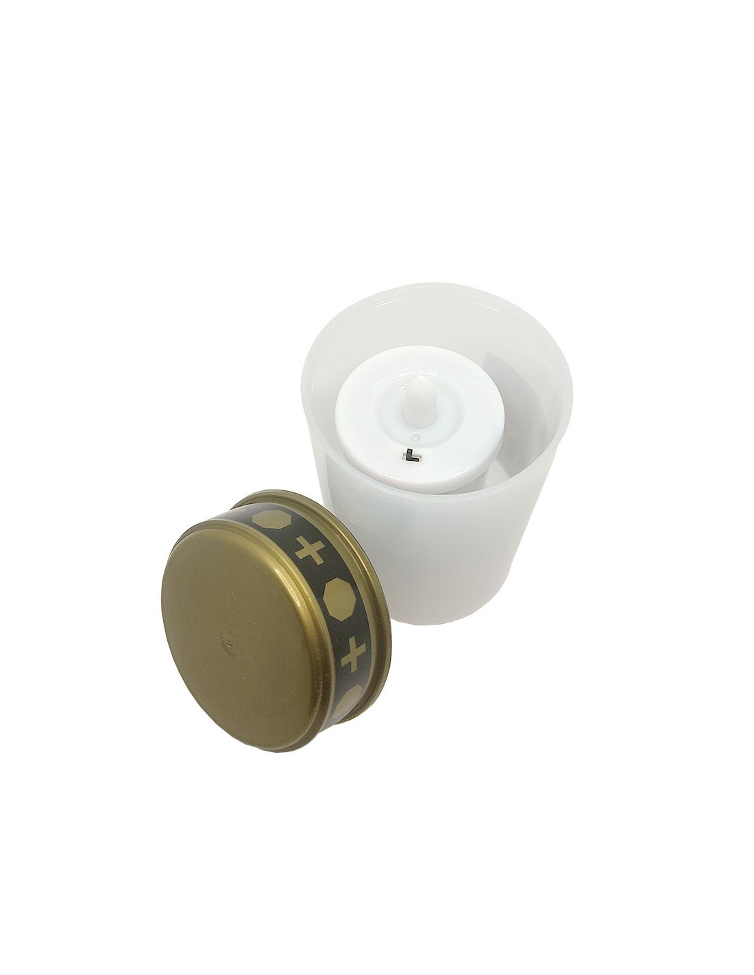 Esta vela LED es ideal para la decoración de exteriores. Para un rincón del jardín con un toque espiritual o como ofrenda en un cementerio o iglesia, esta vela resistirá las inclemencias del tiempo. El recipiente blanco es ligeramente translúcido para dar un efecto de fotóforo. La vela LED del interior imita el parpadeo de una llama para lograr un efecto realista. El conjunto está cubierto por una tapa dorada con símbolos de cruces impresos en el borde.