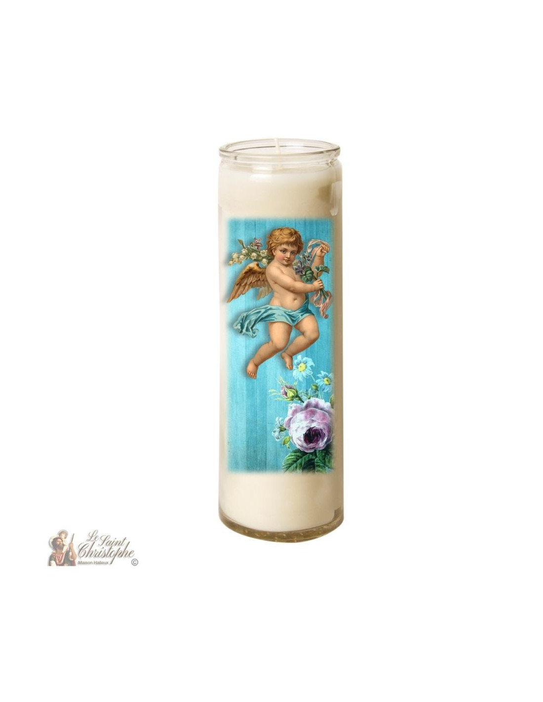 Con la imagen de un querubín sosteniendo flores sobre un fondo azul como decoración, esta vela puede ser utilizada para la oración, la meditación, la decoración o incluso el esoterismo.