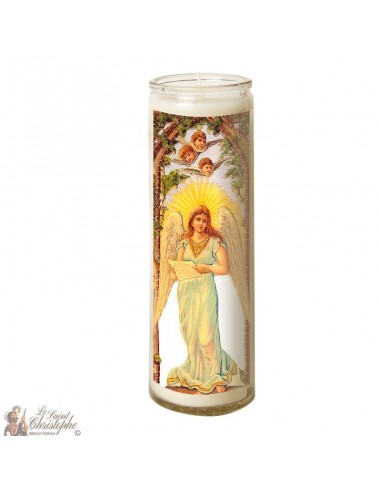 Con una hermosa imagen de un ángel radiante bajo un arco de piedra decorativa, esta vela se puede utilizar para la oración, la meditación, la decoración o incluso el esoterismo.