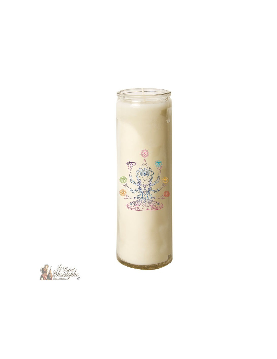 Con la imagen de los siete chakras rodeando a un yogui con múltiples brazos como decoración, esta vela se puede utilizar para la oración, la meditación, la decoración o incluso el esoterismo.