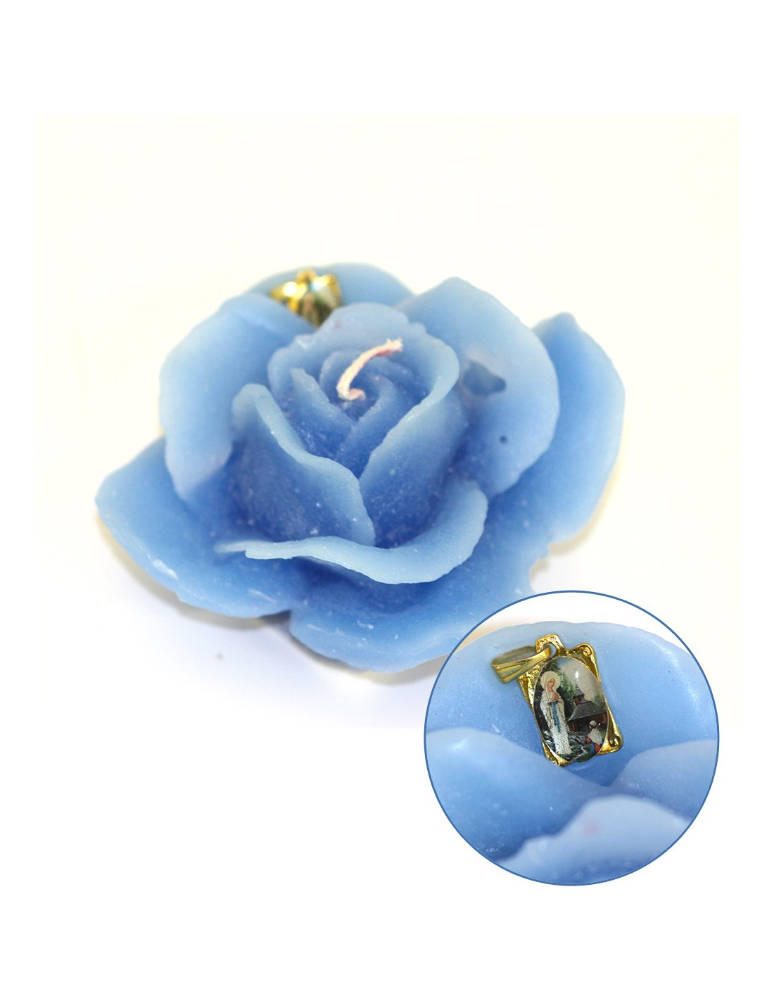 Vela con rosas rojas y pin de la Virgen Milagrosa