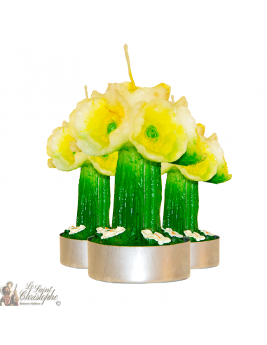 Esta vela decorativa en forma de ramo de narcisos es adecuada para todo tipo de eventos: boda, mesa festiva, comunión... Este artículo se vende por juego de tres piezas, le aportará una homogeneidad en su decoración o en su interior. Con su gradiente de color amarillo en las flores del ramo, es también ideal como decoración de temporada para la primavera o la Pascua, por ejemplo.