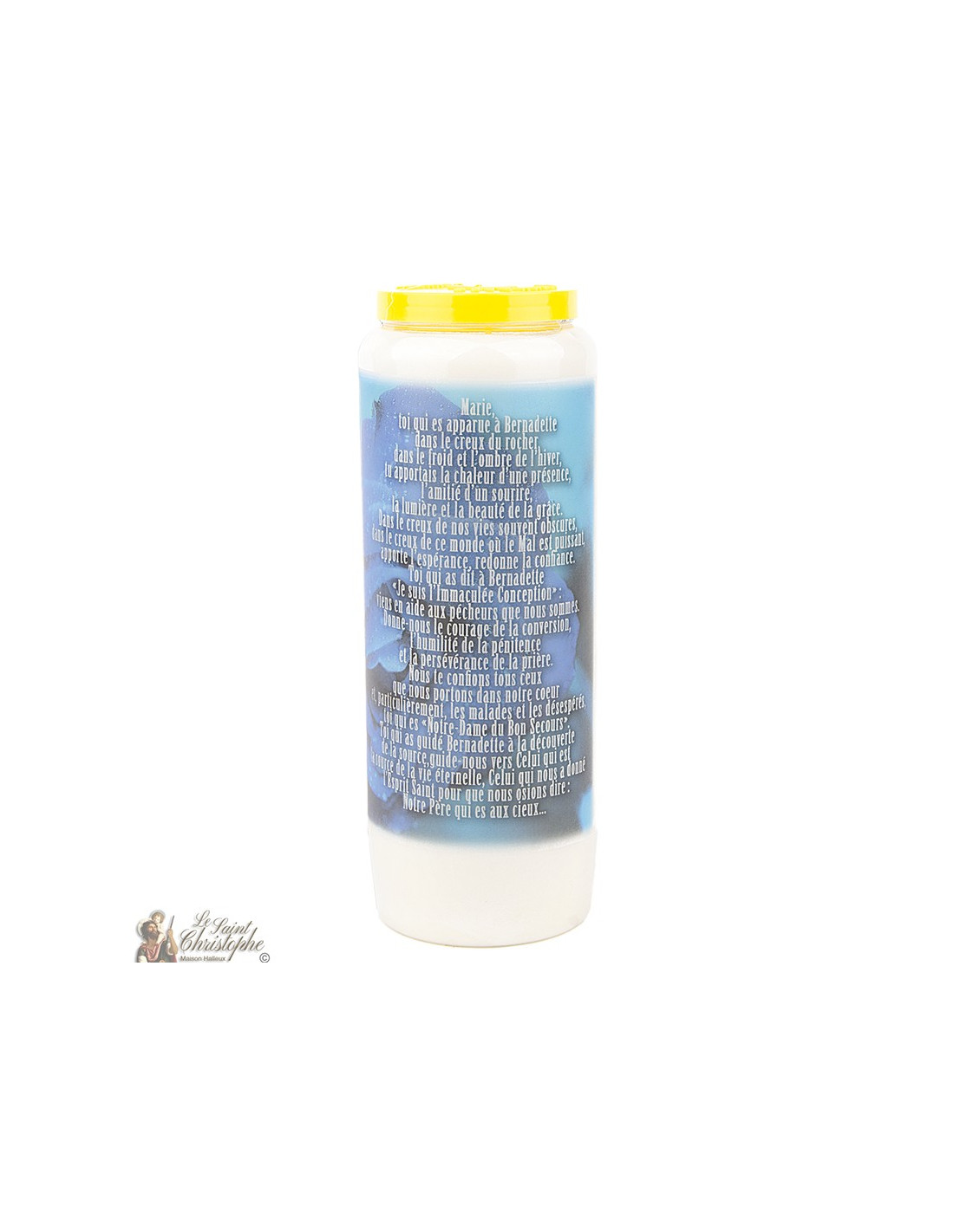 Vela de novena con la imagen de Nuestra Señora de Lourdes con oración en el reverso.