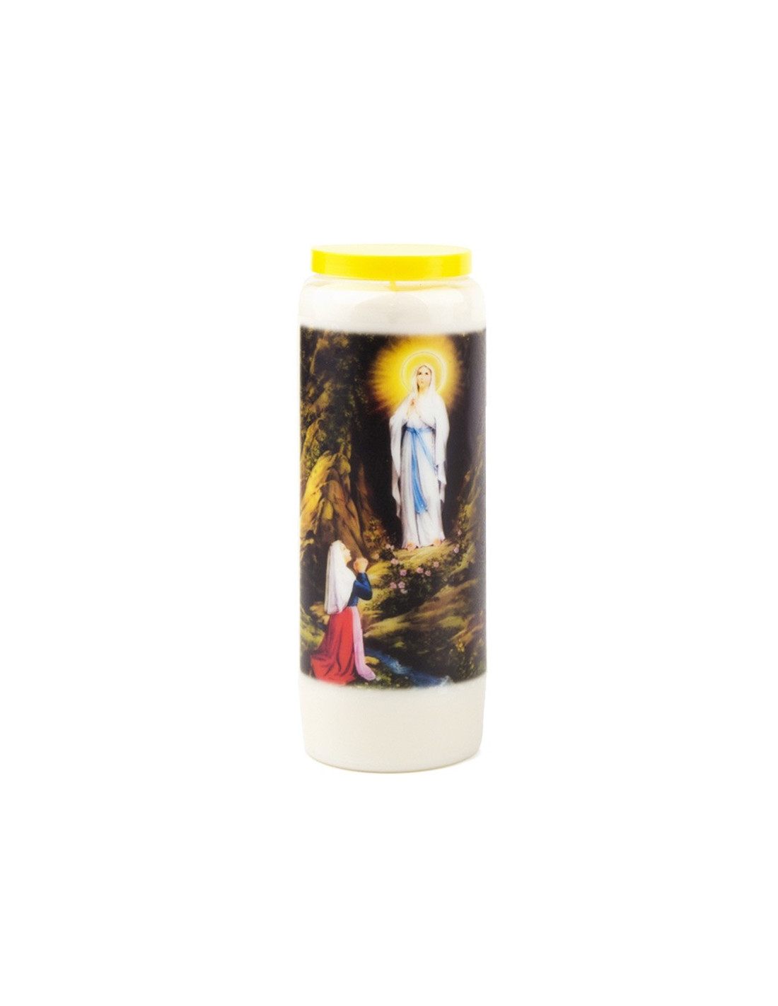 Cirio de novenario blanco a la imagen de Nuestra Señora de Lourdes, 1er modelo, con la aparición en grande, y oración al dorso.