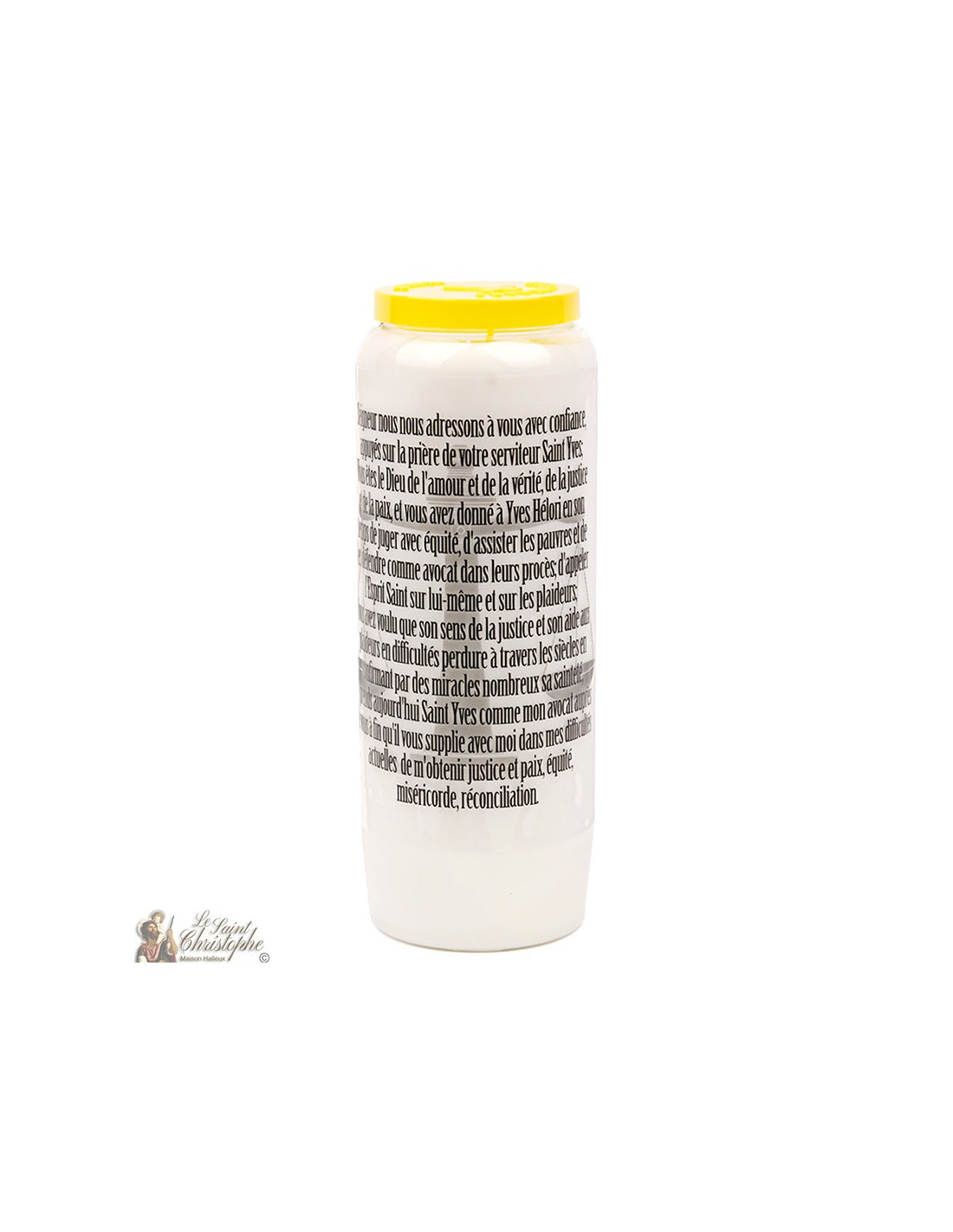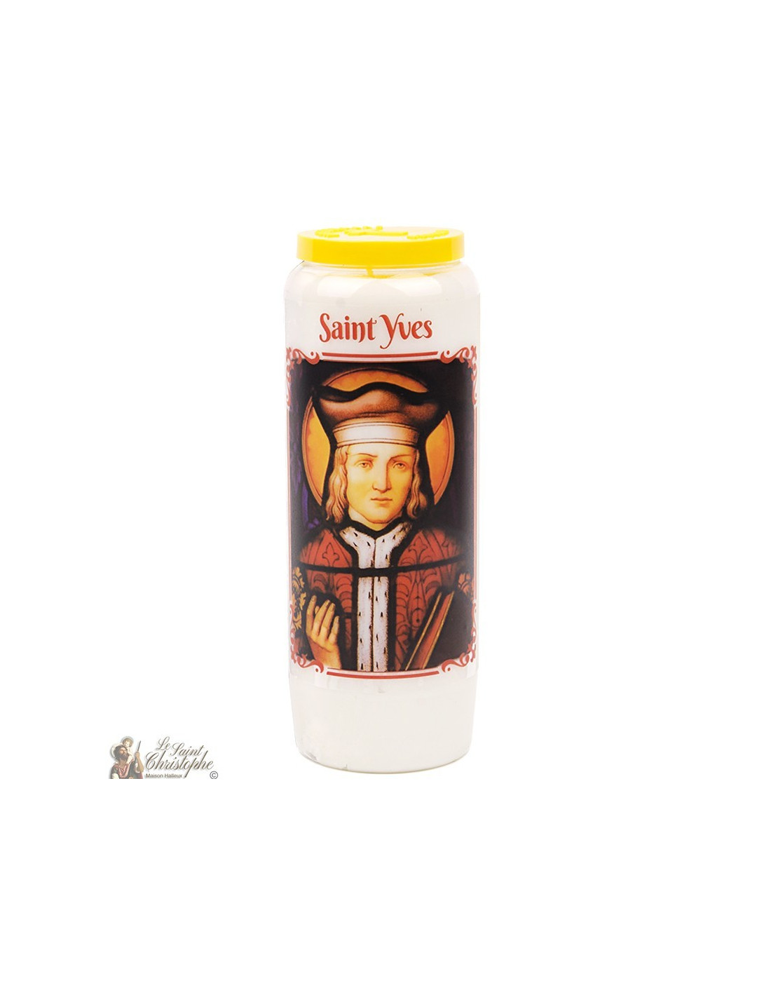 Vela de novena con imagen de San Ivo y oración dedicada a él en el reverso.