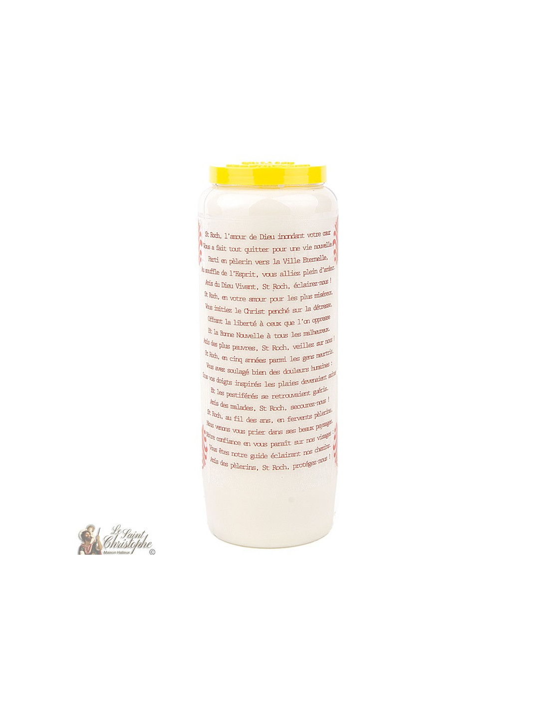 Vela de novena blanca con la imagen de San Roque y una oración dedicada a él.