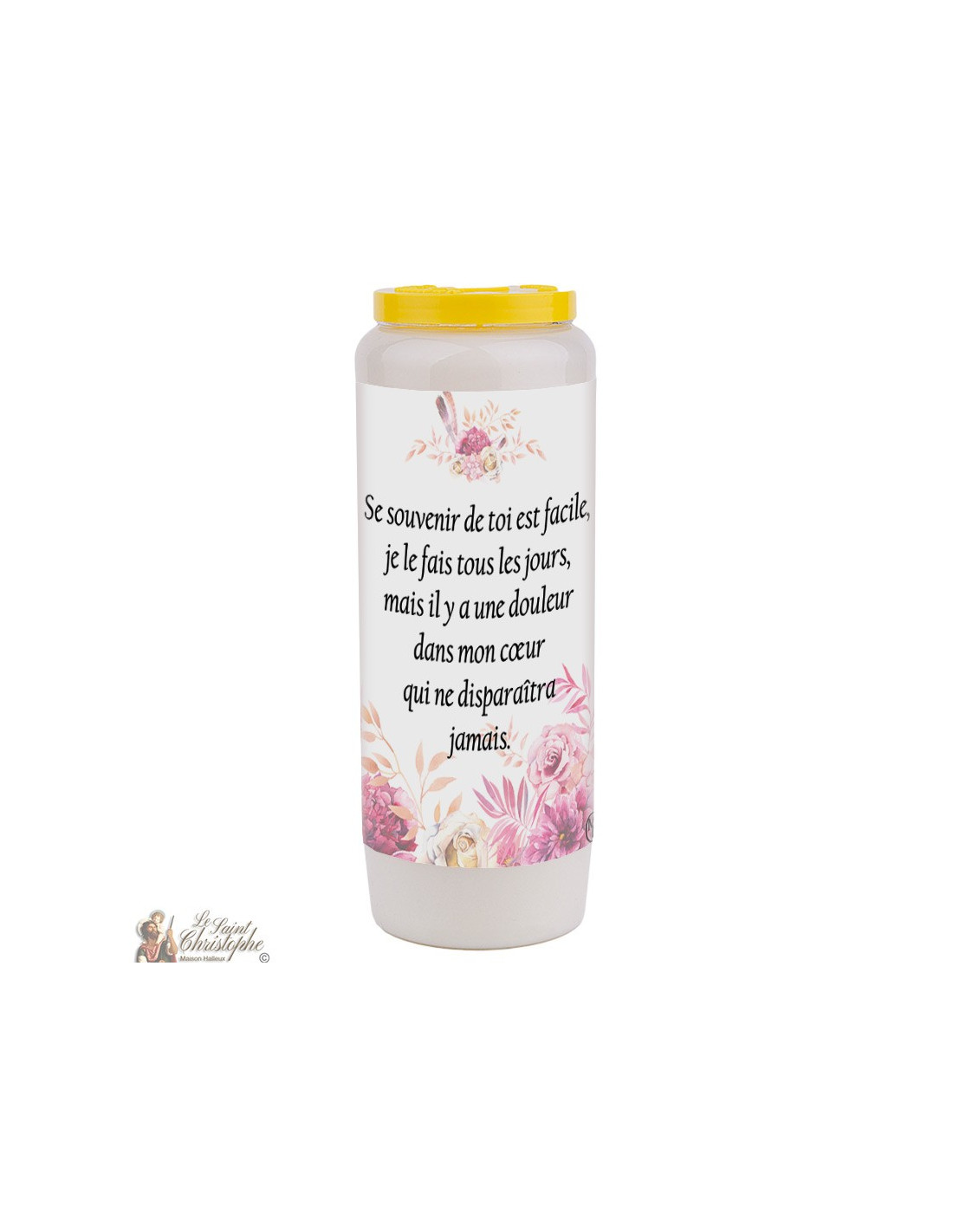 Vela de novena vegetal con la imagen de su elección en la parte delantera y la oración en la parte trasera dedicada a un ser querido fallecido.