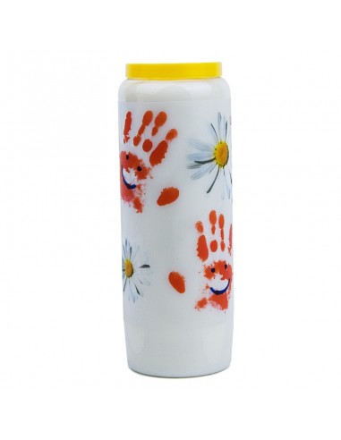 Vela de novena con la imagen de pinturas de manos de colores y una oración en el reverso.