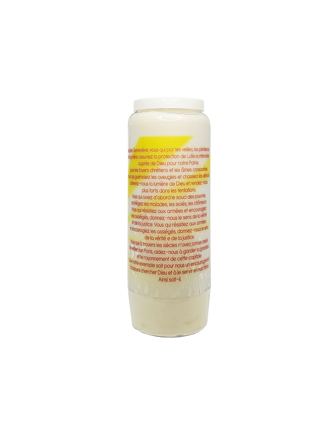 Vela de novena con la imagen de Santa Genoveva en el anverso y una oración en el reverso.