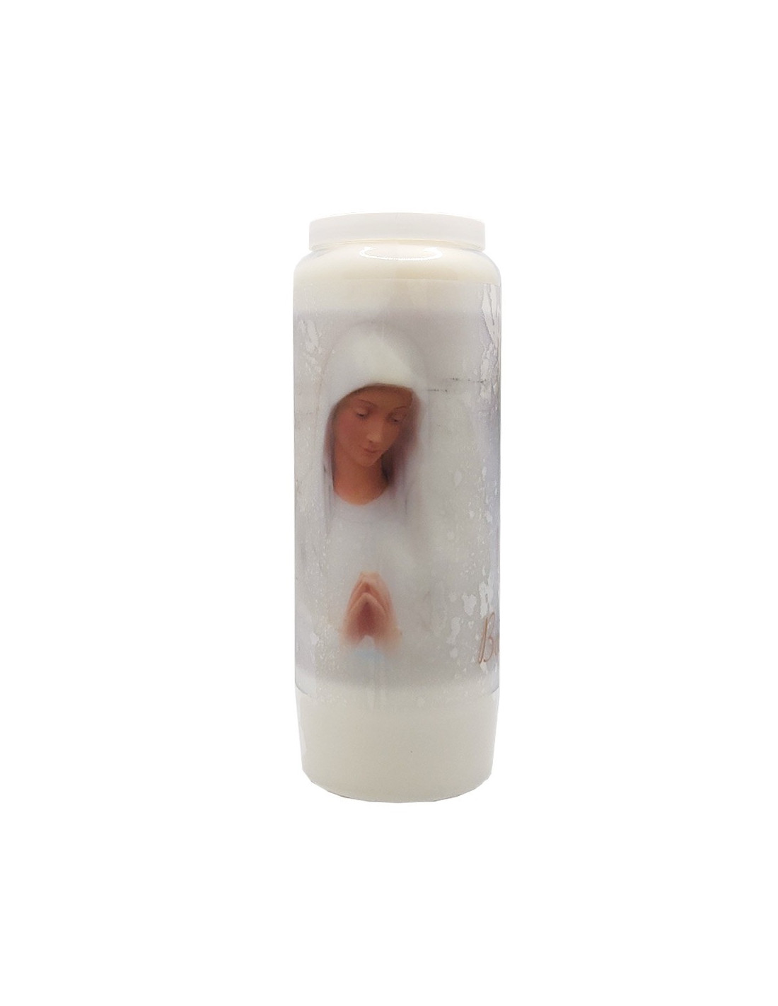 Vela de novena con la imagen de la Virgen de los Pobres de Banneux Notre-Dame, con una ilustración de la capilla en el reverso. 9 días de duración.