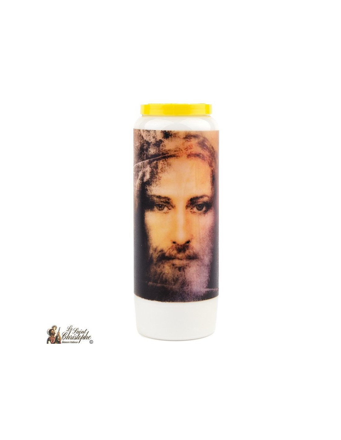 Vela de novena con imagen de la Santa Faz de Jesucristo y oración en el reverso.