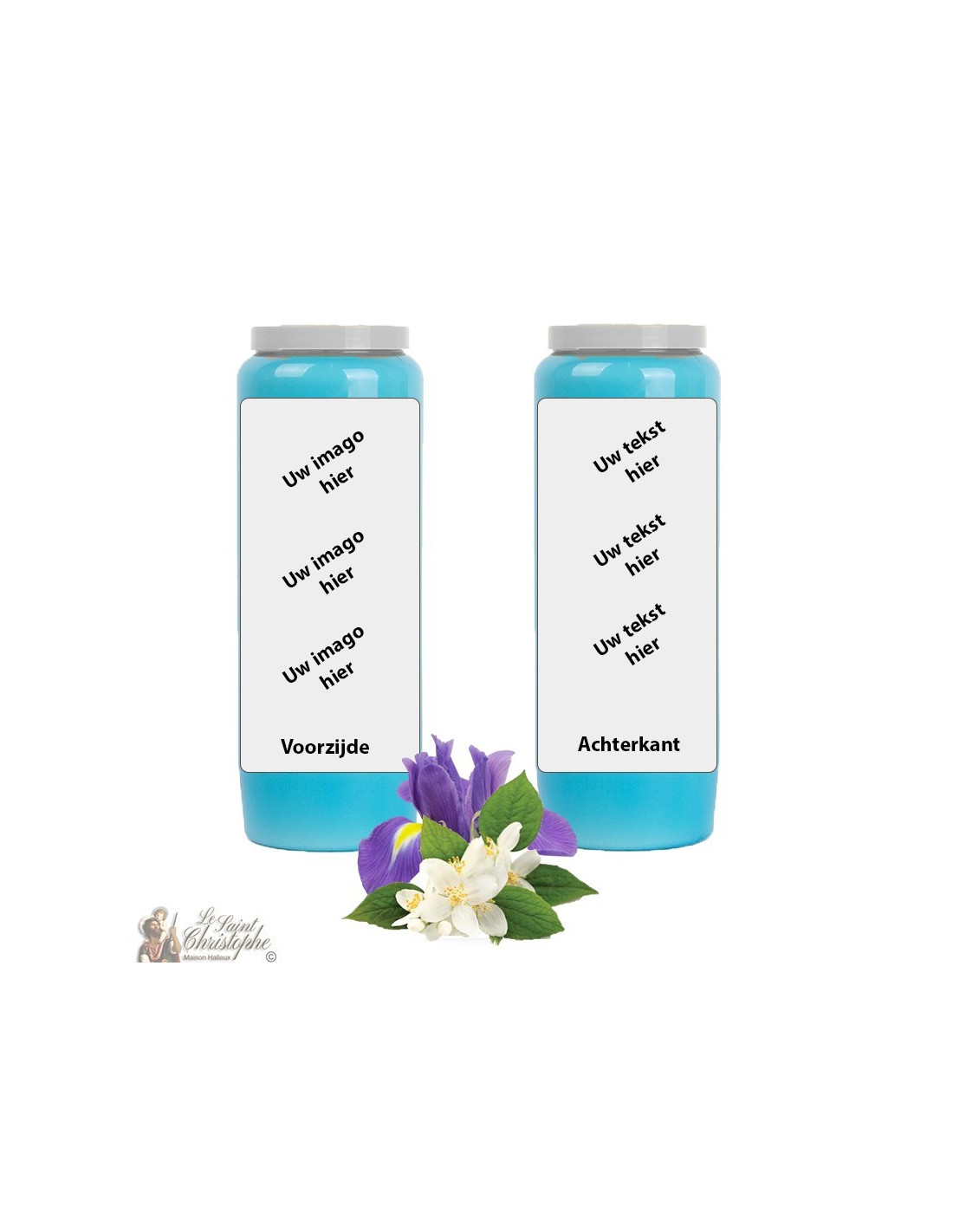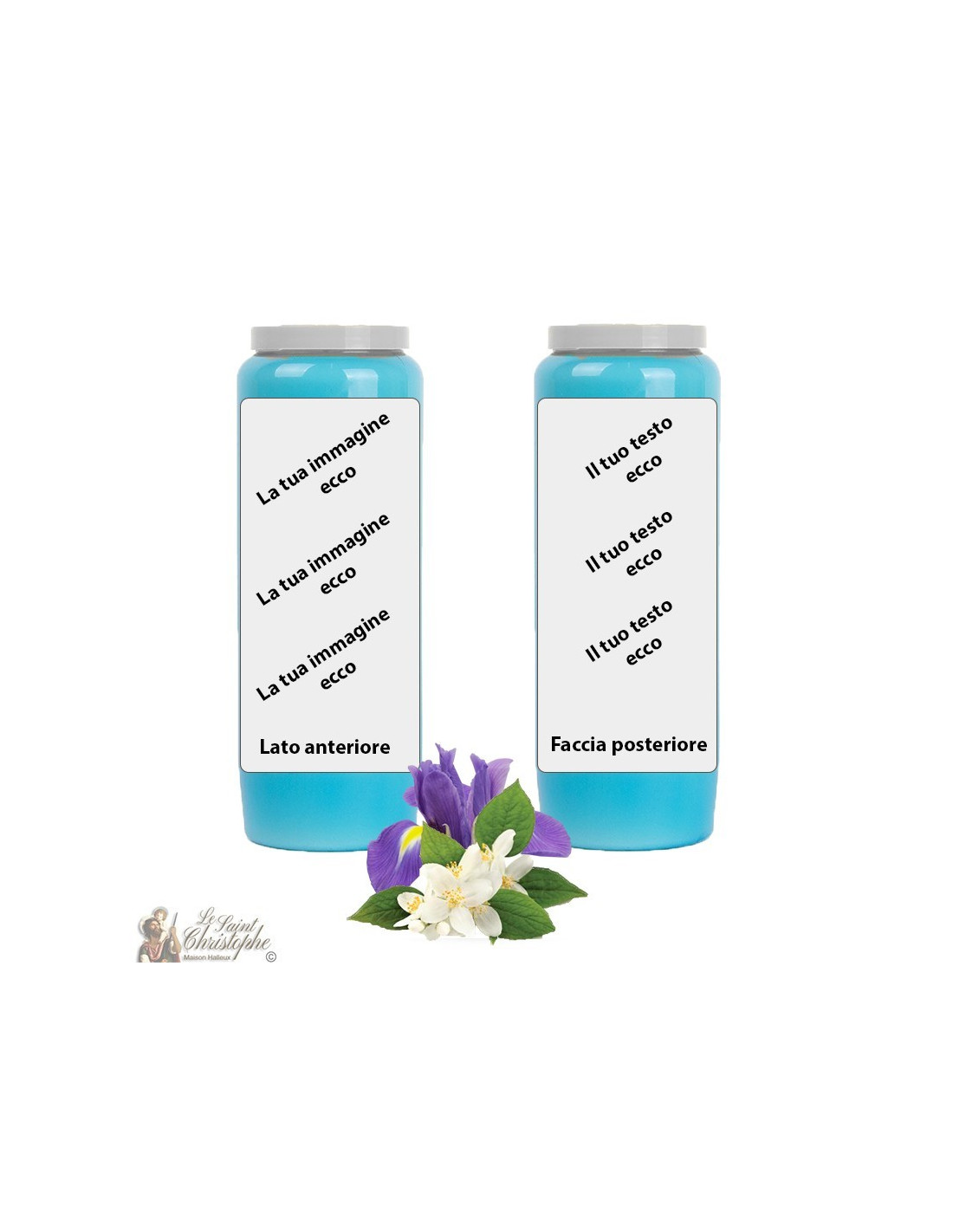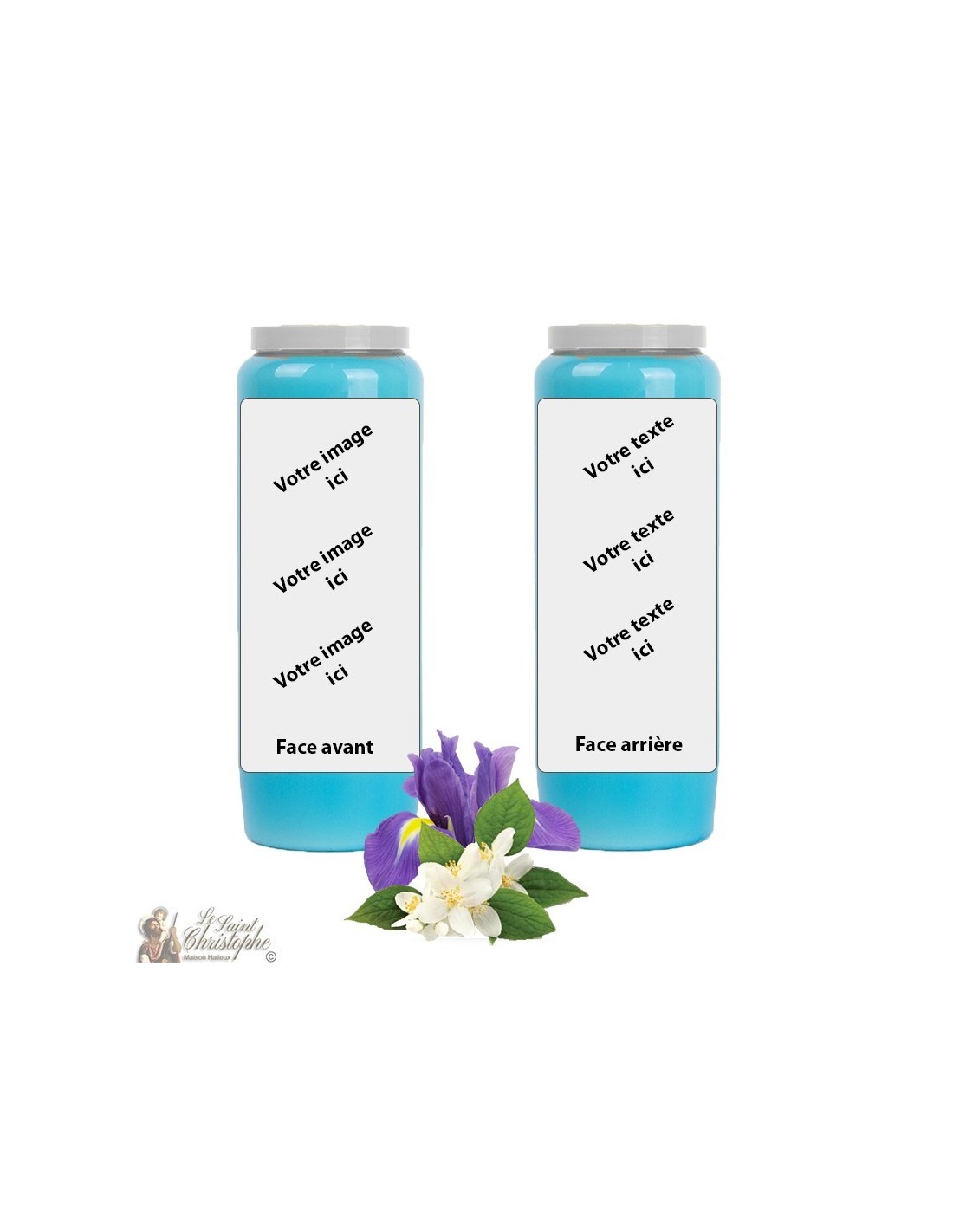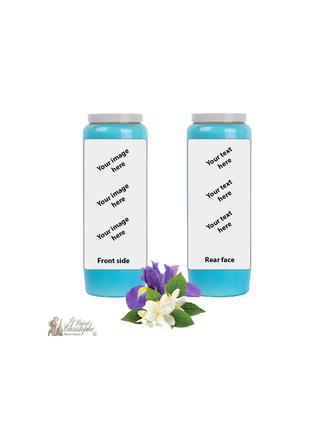Vela de novena azul claro con aceite vegetal perfumado de jazmín-iris, personalizable con su imagen y texto. La mezcla de jazmín e iris aporta calma y mejora la calidad del aire.