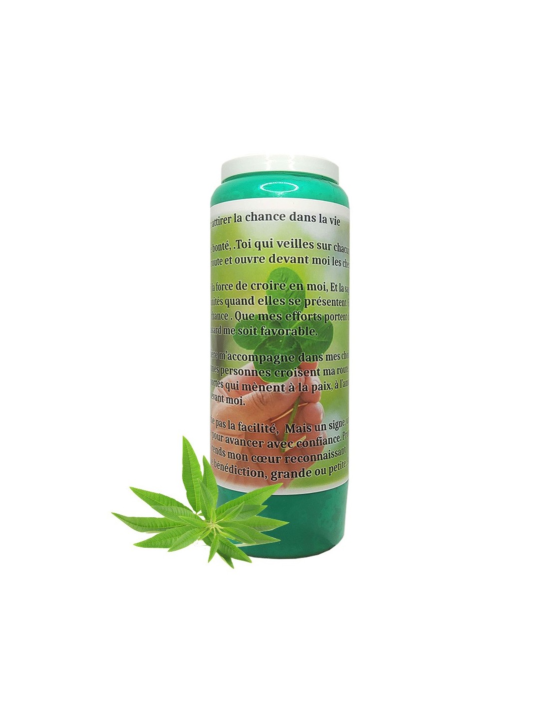 Vela de novena con imagen de trébol de 4 hojas y oración para atraer la suerte en la vida, color verde y delicadamente perfumada con verbena.