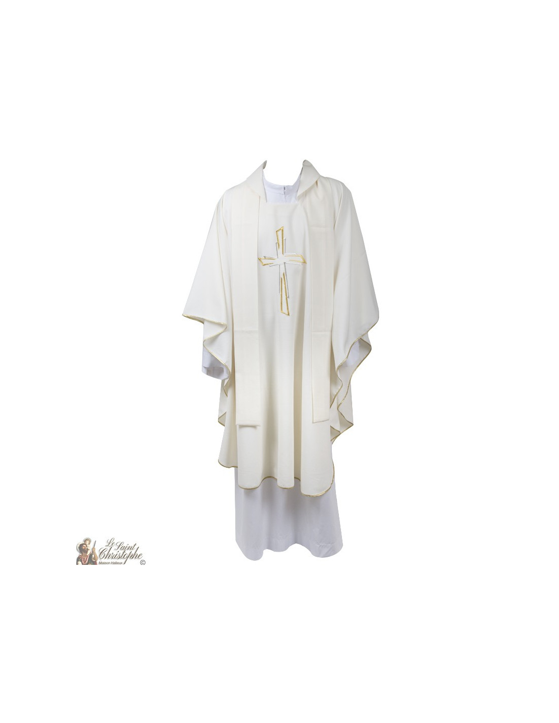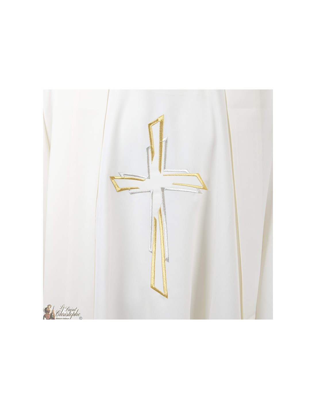 Casulla sacerdotal blanca crema con estola crema bordada con una cruz dorada y plateada en estilo estallado. La casulla está decorada con un borde dorado. El bordado es de doble cara.