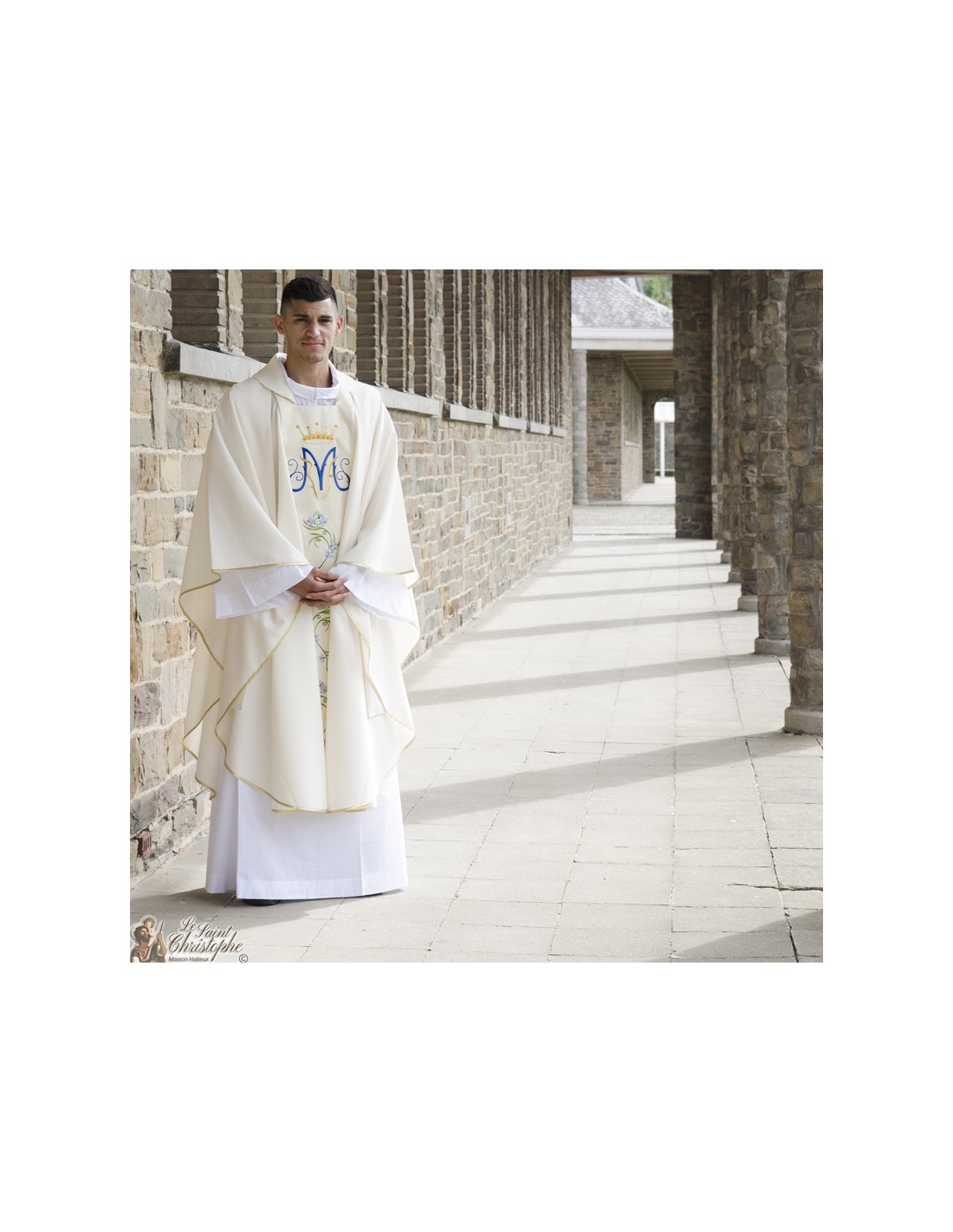 Casulla sacerdotal de color blanco crema con estola con el símbolo mariano bordado en hilo dorado y azul, así como elegantes diseños redondos con lirios blancos en hilo blanco, verde y dorado. La casulla está decorada con un borde dorado. El bordado es de doble cara.