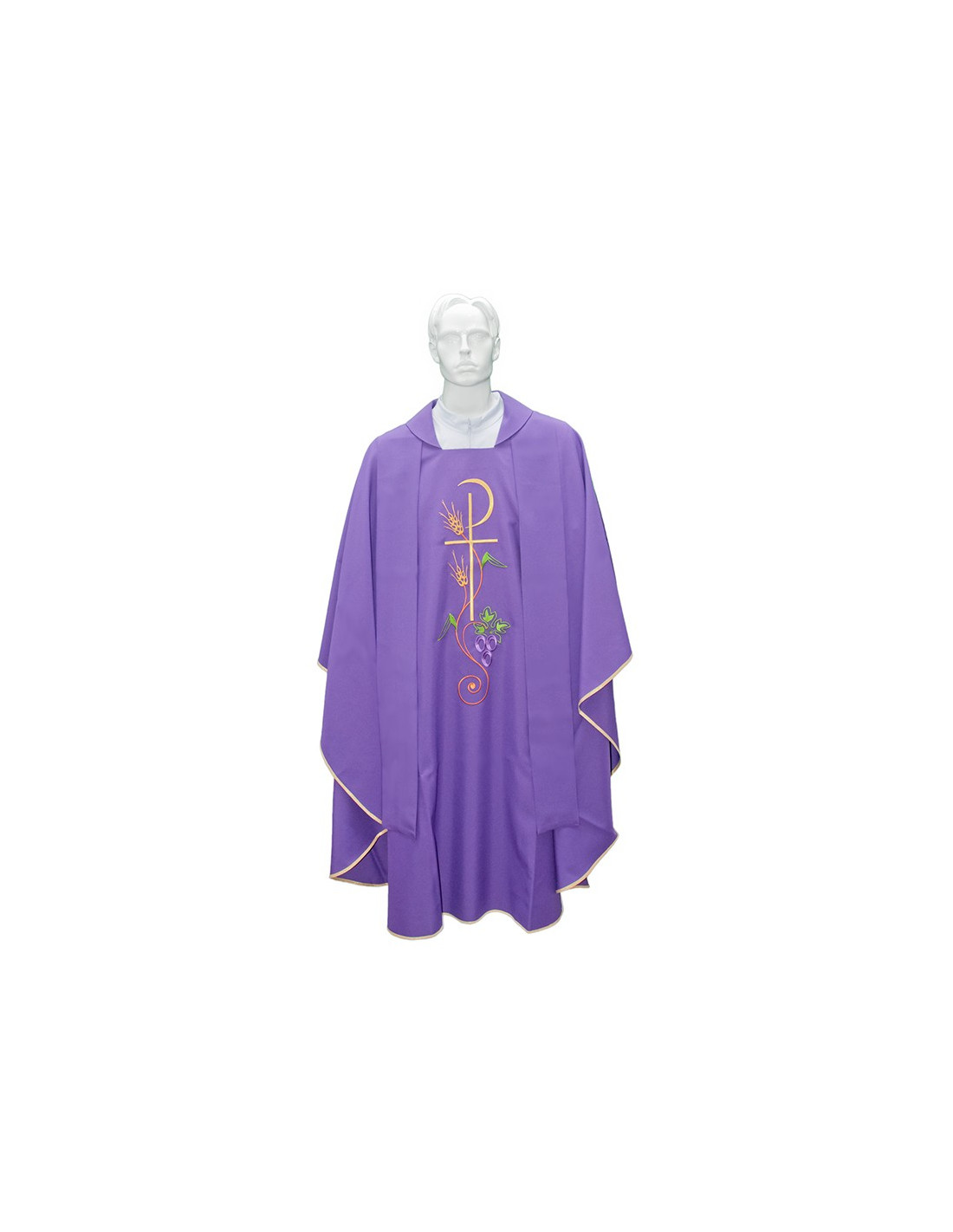 Casulla para los sacerdotes, de color púrpura, con una estola bordada con una fina cruz rodeada de espigas, uvas y un halo luminoso, todo ello en oro o hilos de colores. La casulla está decorada con un borde dorado. El bordado es de doble cara.