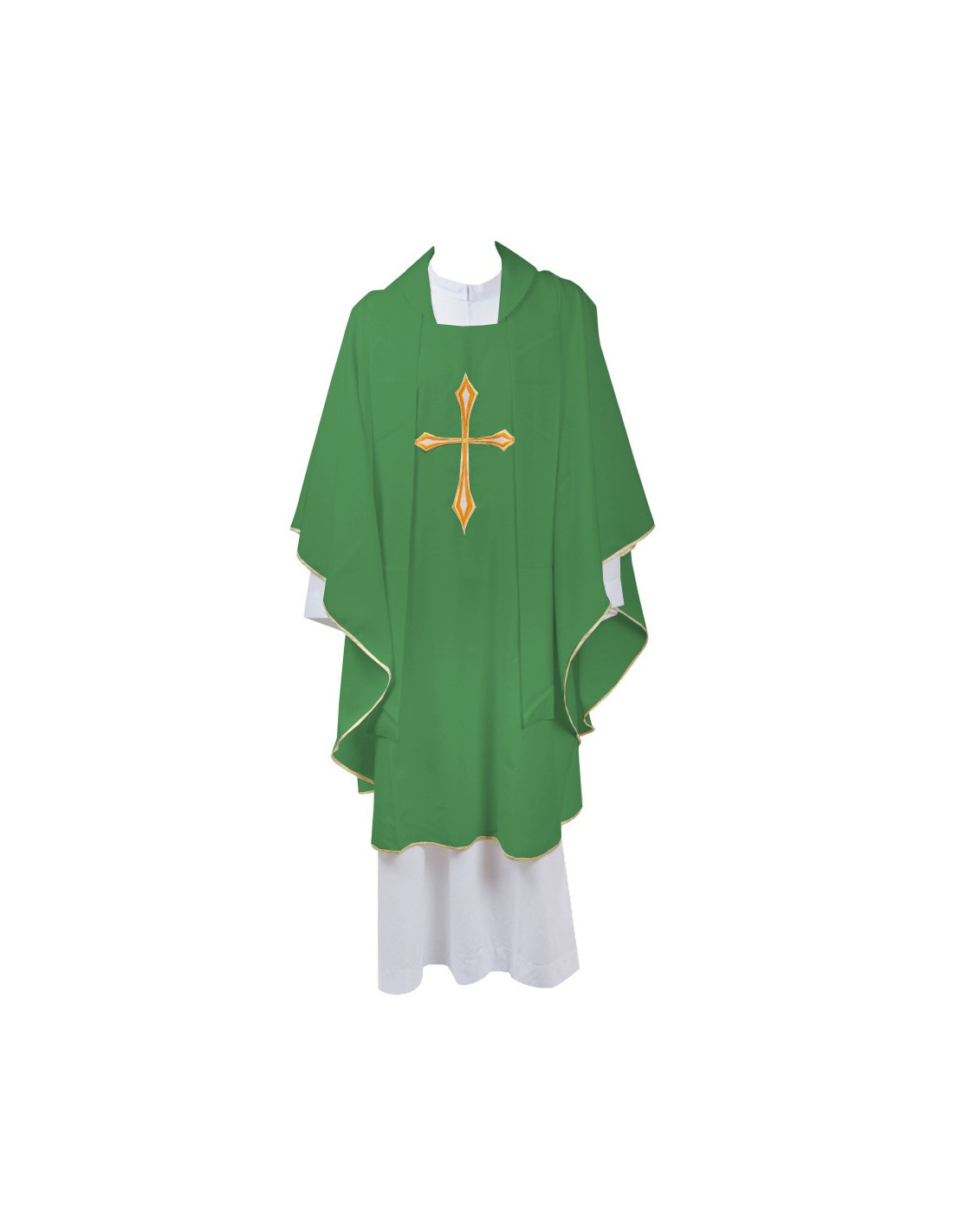 El verde es el color de la esperanza, la vida y el crecimiento espiritual, y se utiliza durante todo el Tiempo Ordinario en el calendario litúrgico. Esta casulla encarna este simbolismo con elegancia y sencillez. Su corte holgado y su tejido fluido garantizan una caída armoniosa, mientras que el bordado a doble cara (delantera y trasera) realza la belleza de la prenda desde todos los ángulos. El ribete dorado realza discretamente el efecto general, aportando un brillo sutil y respetuoso al ambiente litúrgico.