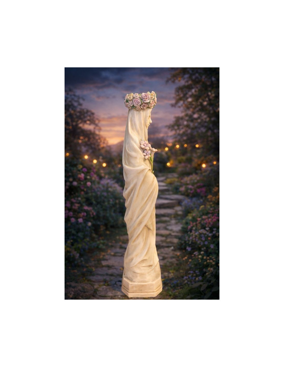 Esta hermosa estatua de la Virgen María con corona de flores destaca por su suave y elegante estilo vintage. Con una altura de 50 cm, representa a María con una expresión serena y una delicada corona floral que simboliza pureza y belleza.