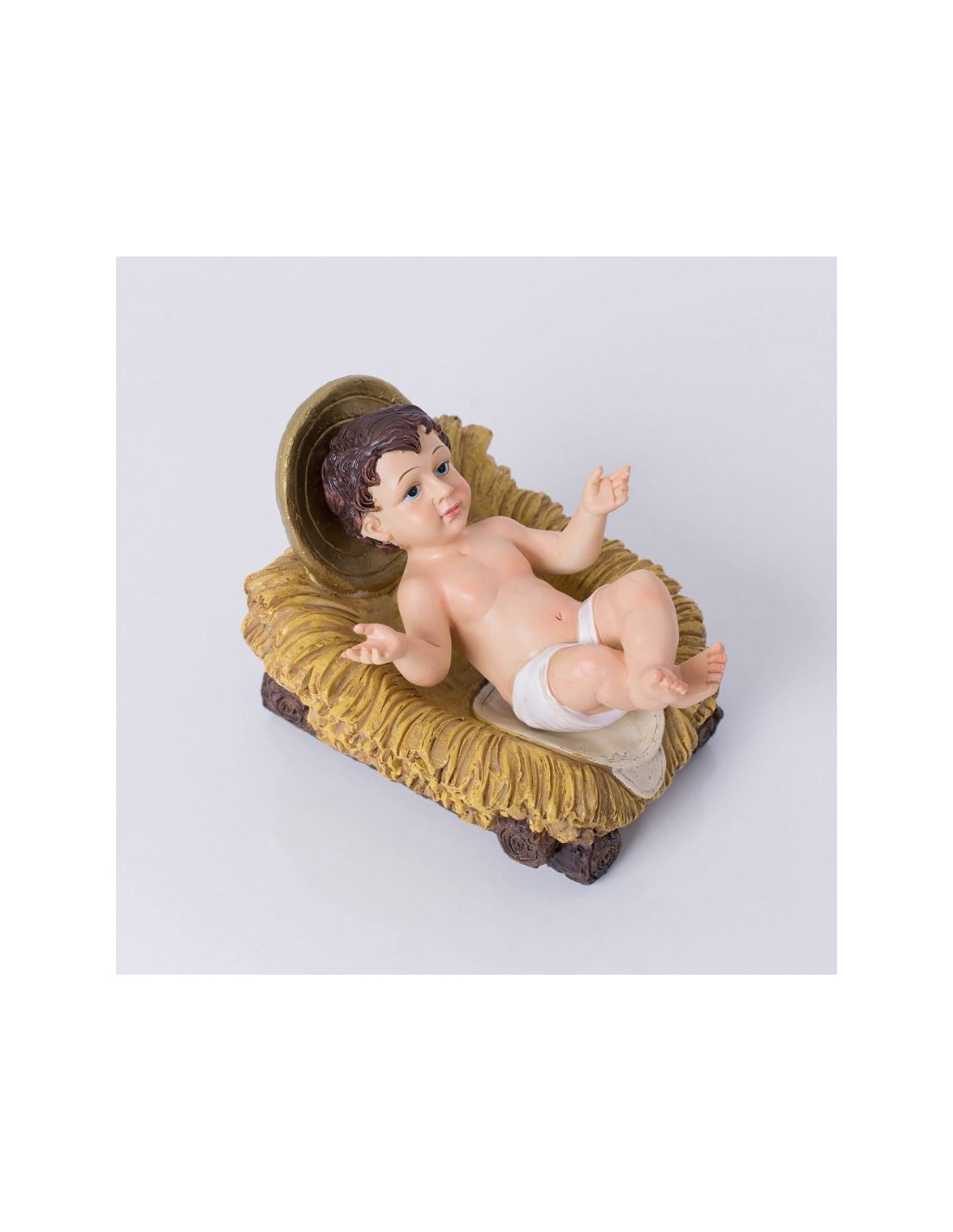 Cette figurine du petit Jésus est une décoration fondamentale des crèches de Noël. Réalisé en résine peinte, cette statuette est réaliste est dotée de couleurs naturelles et vivantes, avec un petit ajout de doré pour l'auréole de Jésus Christ.