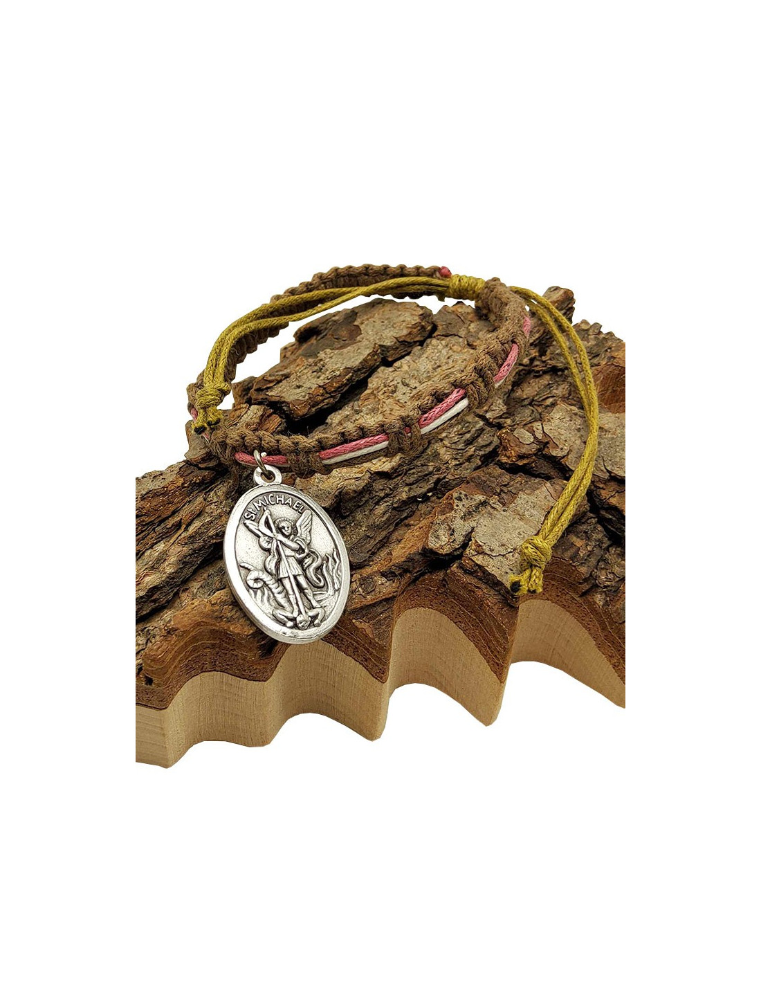 Bracelet en cordes tressées aux couleurs naturelles avec médaille en métal fantaisie de l'Archange Saint Michel et de l'Archange Saint Raphaël. Les cordelettes sont couleur kaki clair, brun clair, blanc et rose. C'est un mélange naturel presque bohème qui s'accorde aisément avec tout.