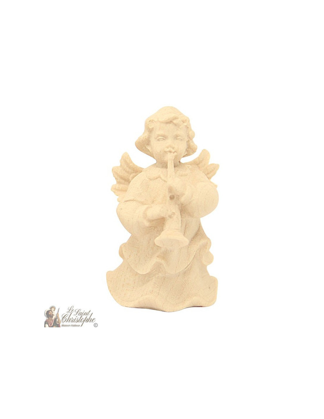 Petit ange musicien en longue toge jouant de la clarinette, sculpté dans un bois naturel à l'essence claire.