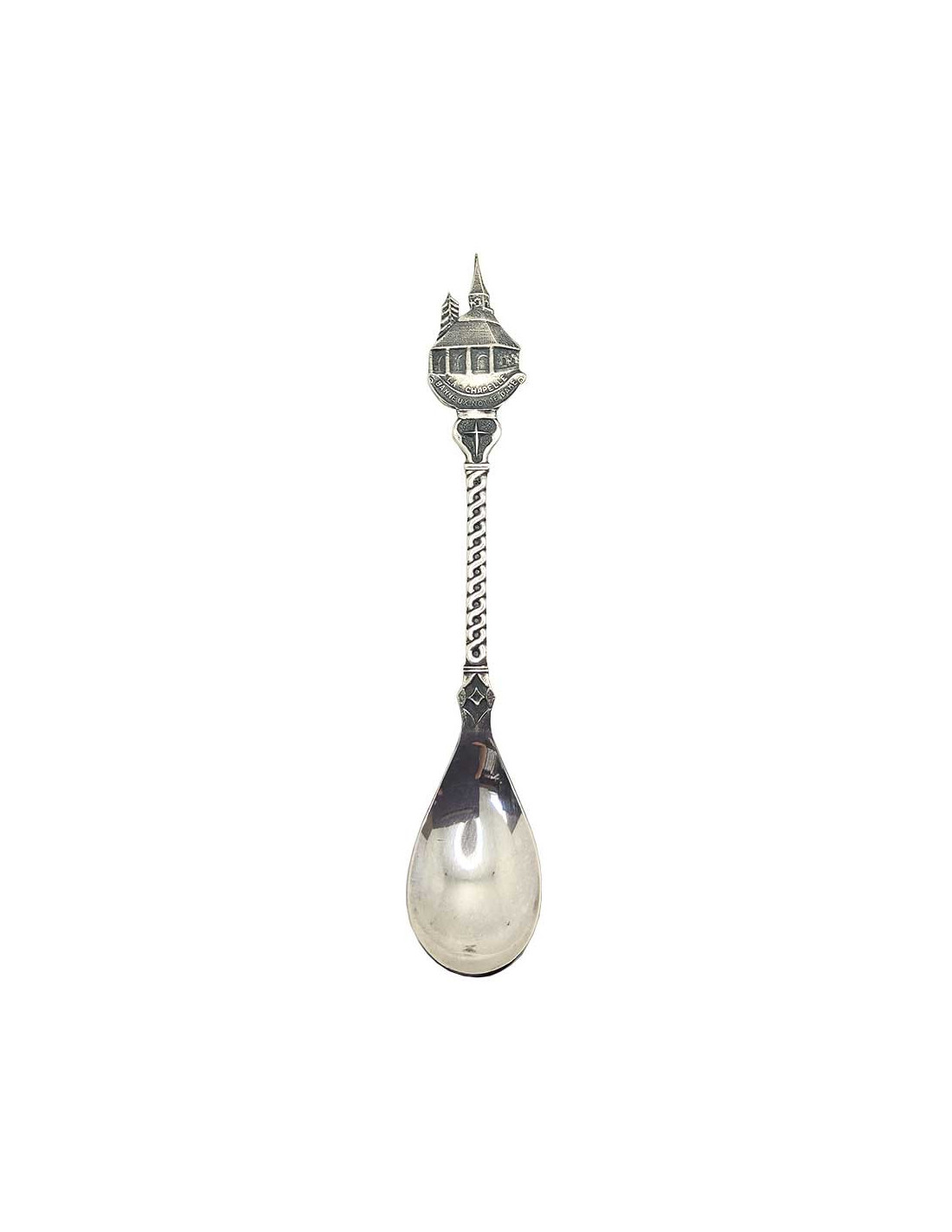 Petite cuillère souvenir de la chapelle de Banneux Notre-Dame, lieu de pèlerinage en Belgique, où est apparue la Vierge des Pauvres. La Sainte Vierge offrit une source miraculeuse pour soulager les maux et unir les nations. Le sommet de la cuillère représente la chapelle bâtie en l'honneur de la Vierge des Pauvres ainsi que d'une croix élégante, le corps de la cuillère étant décoré de boucles entrelacées surmontant une étoile.