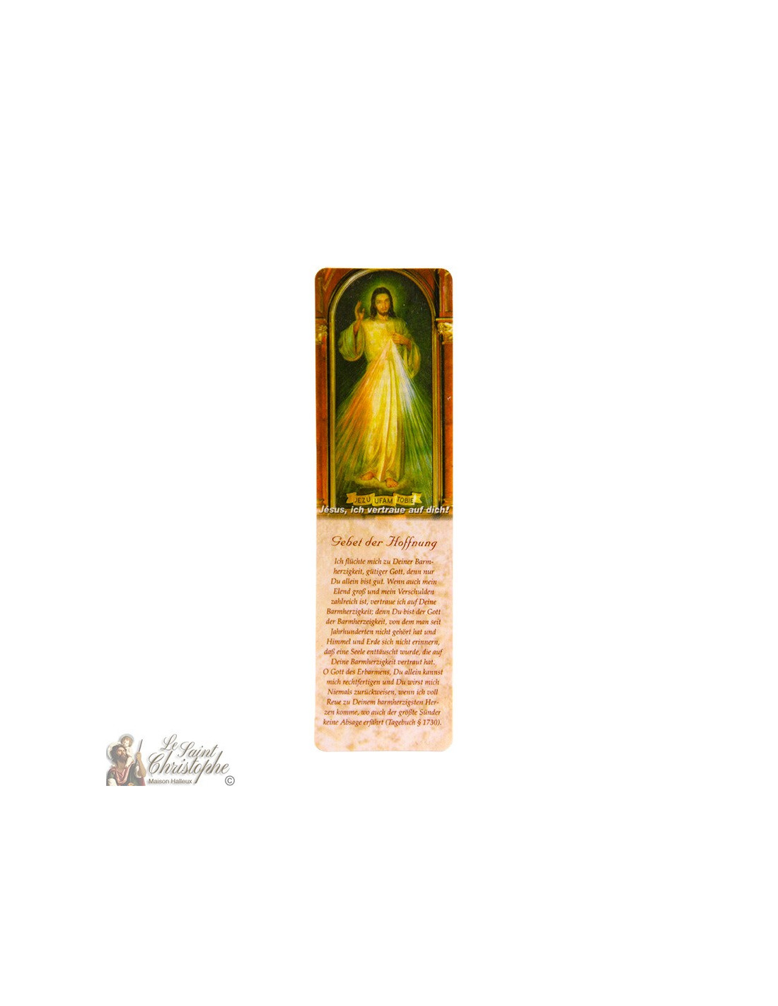 Marque-page décoré tel un parchemin et une arche, avec l'image du Christ Miséricordieux selon l'icône de Sainte Faustine et une prière en son nom issue du Journal de Sainte Faustine.