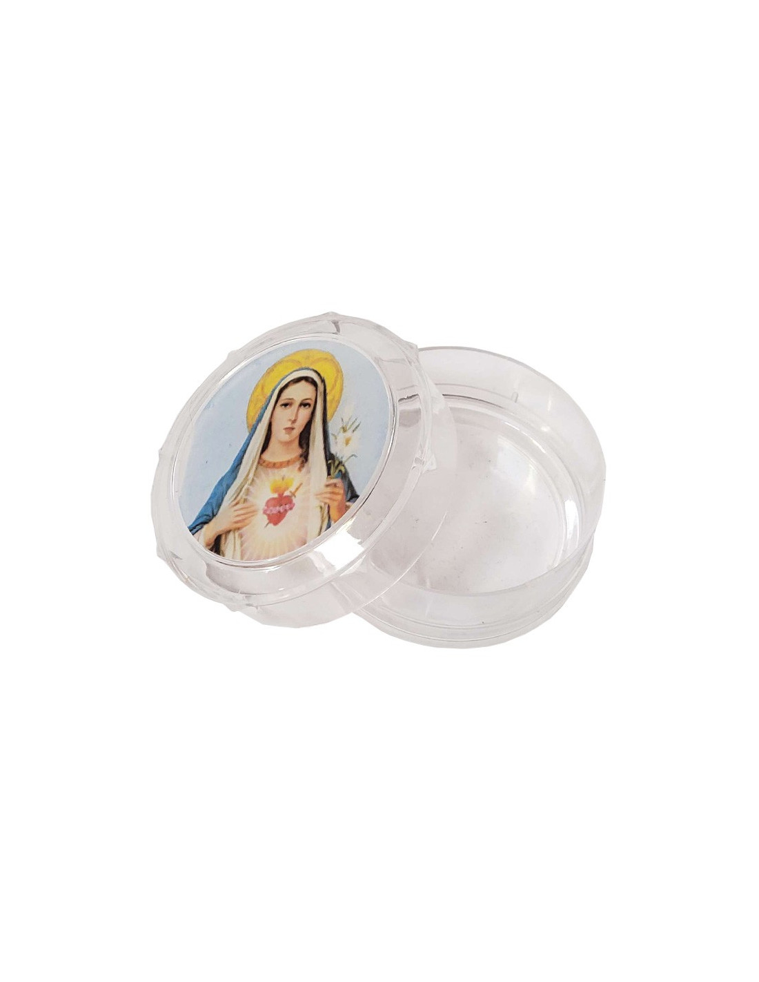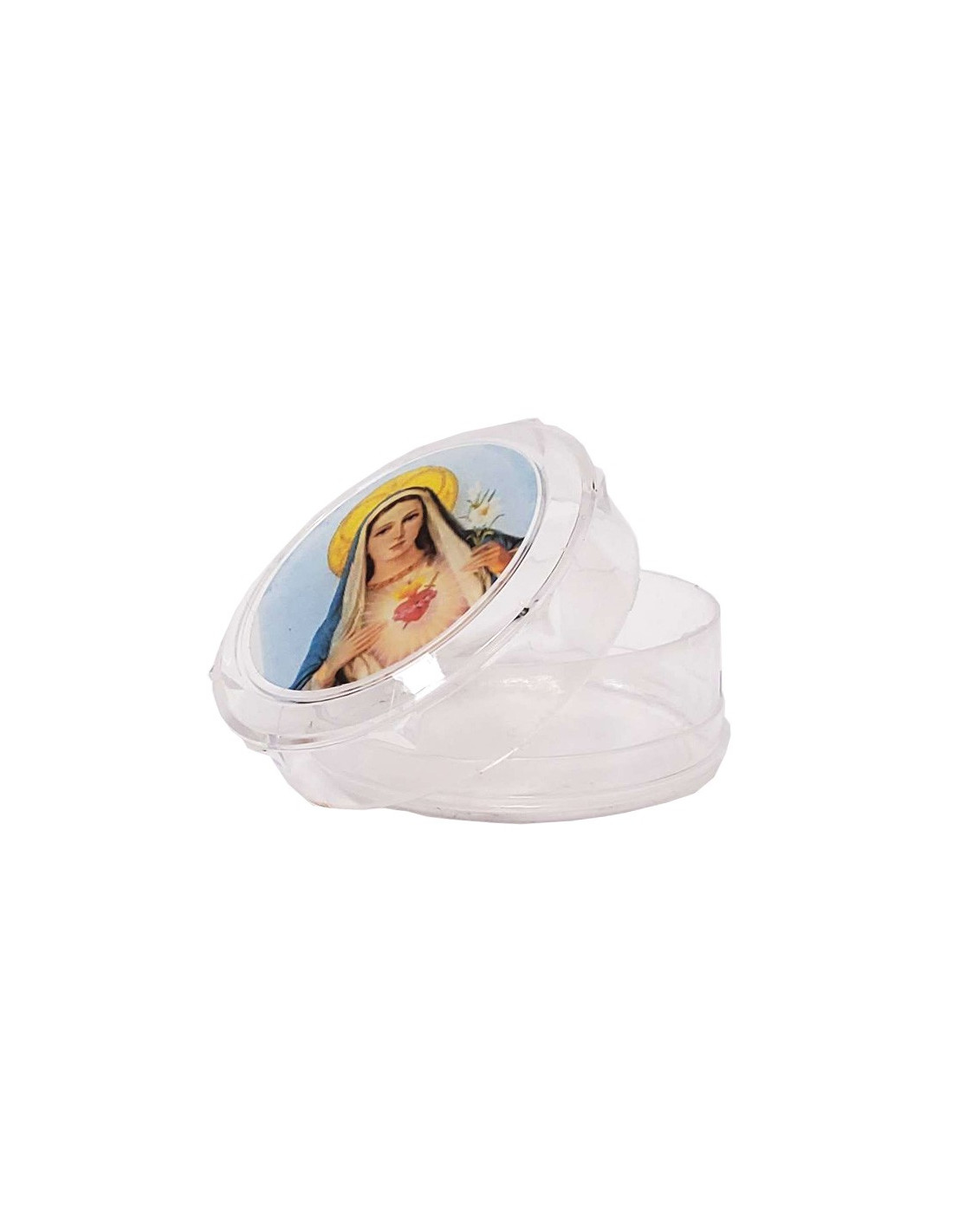 Pyxide en plastique transparent pouvant contenir un chapelet, dizaine, hosties... Elle est un très beau cadeau souvenir pour une communion, un baptême, un mariage ou pour apporter protection.