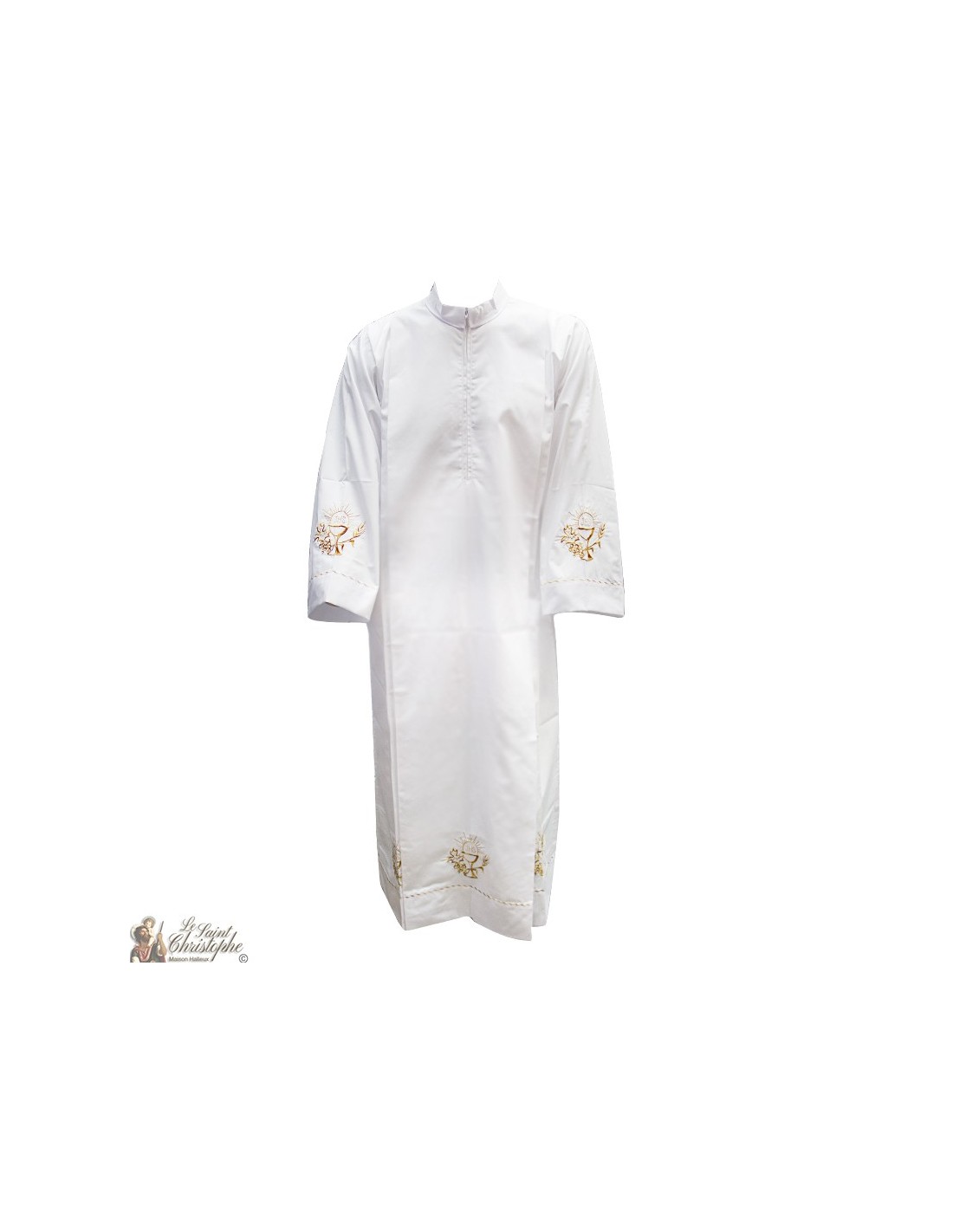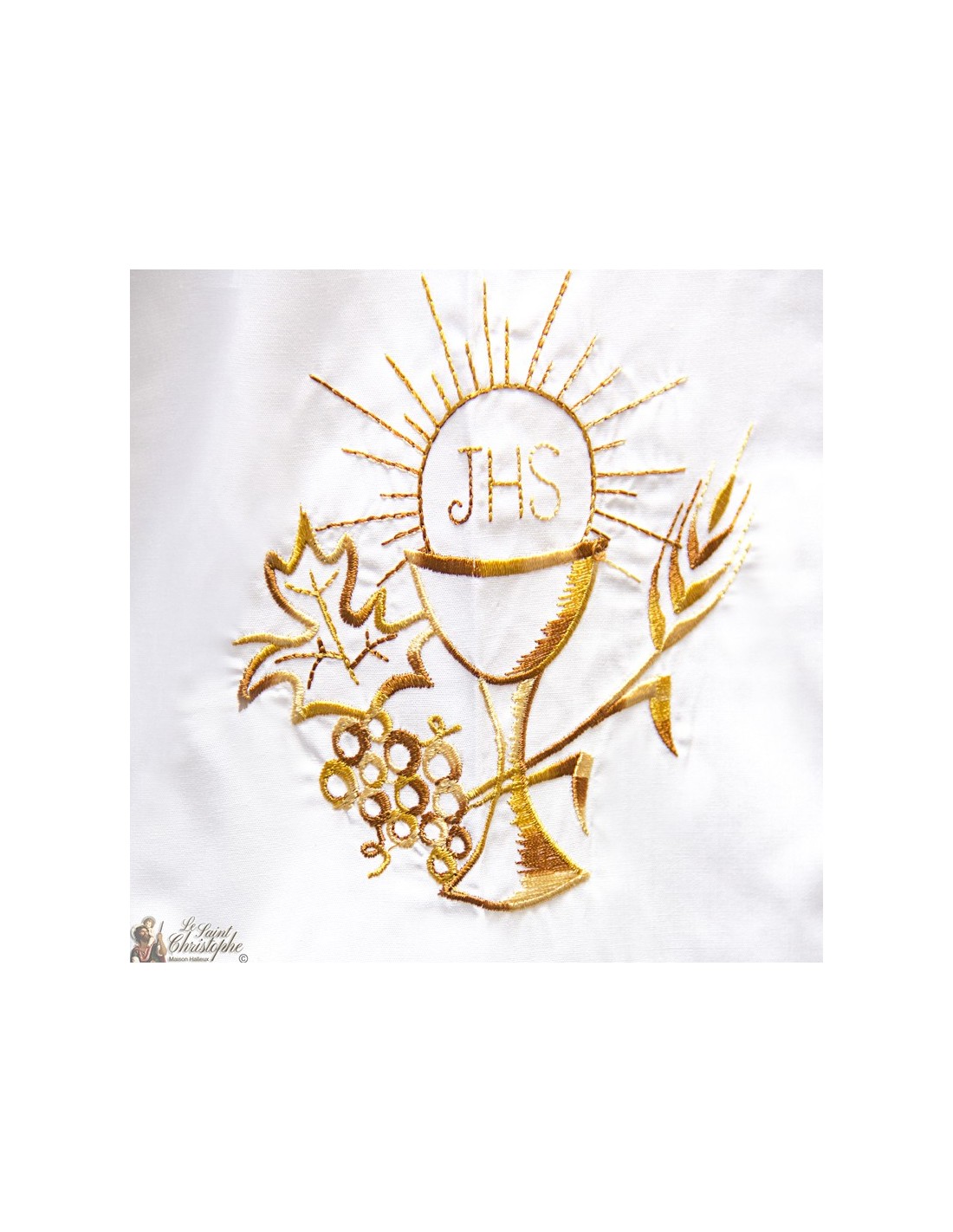 Avec sa fermeture éclair qui permet de l'enfiler aisément, cette aube est en coton et lavable en machine. Les broderies en fils d'or forment un calice entouré de blé et de raisin ainsi que des galons délicats tandis que les plis sur le côtés ajoutent un côté sobre et classique.