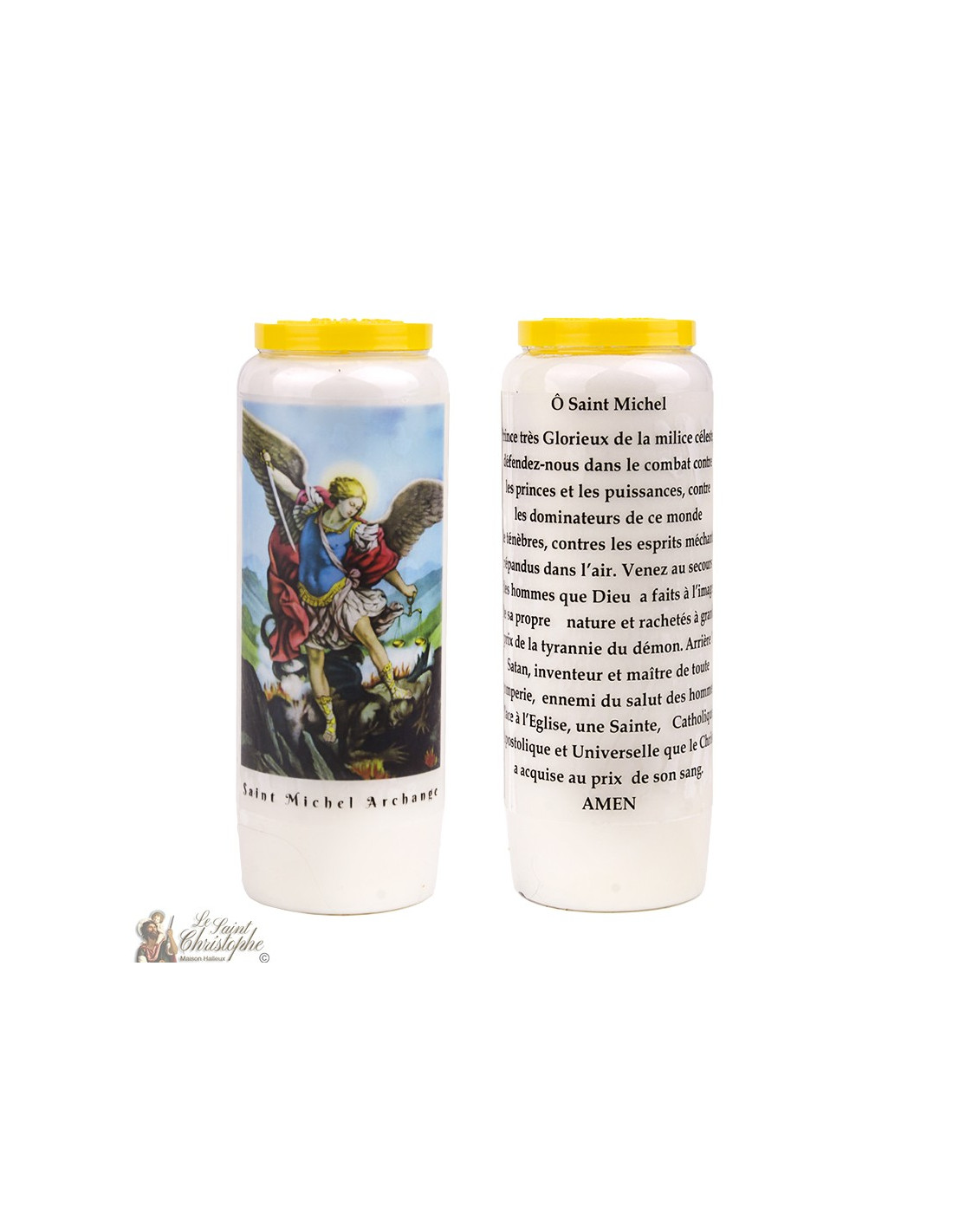 Bougie neuvaine végétale avec image de Saint Michel et prière qui lui est dédiée.