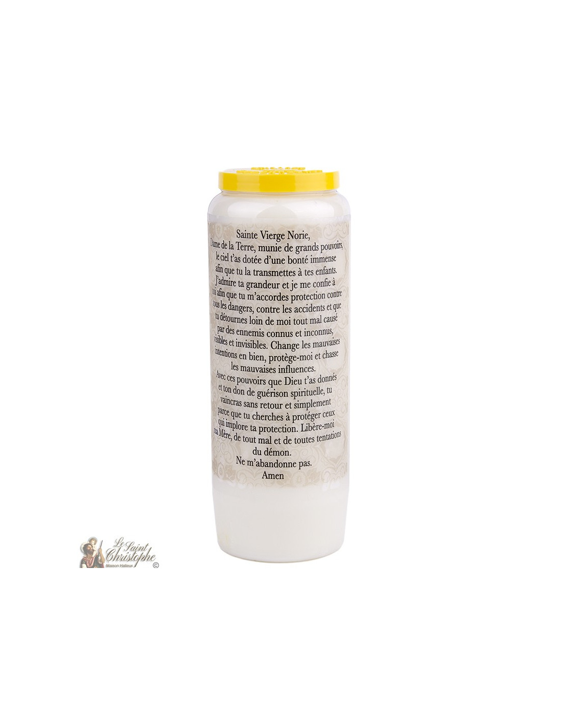 Bougie de neuvaine blanche avec image de la Vierge Noire et prière qui leur est dédiée.