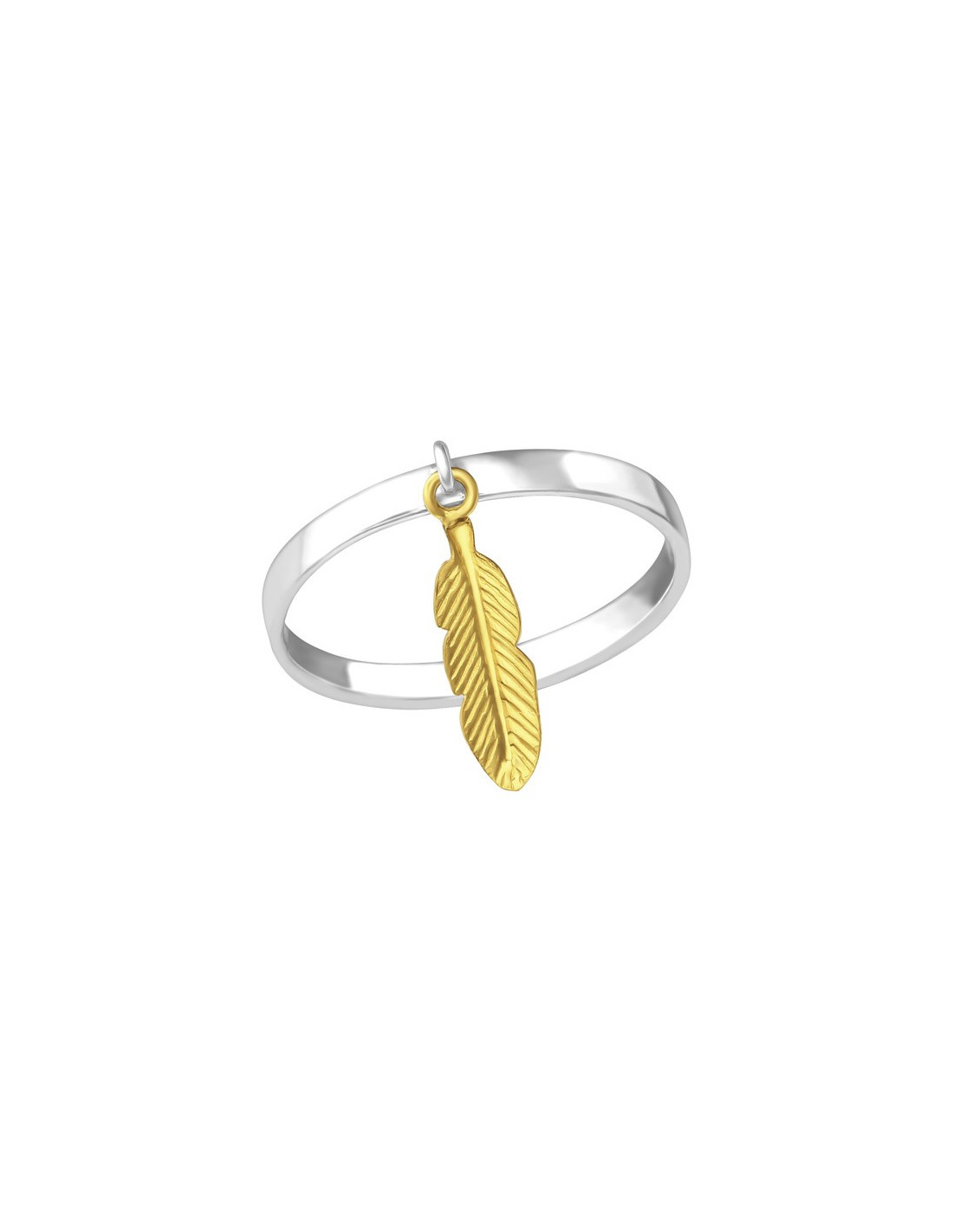Bague en argent 925, en partie plaquée or. L'anneau argenté, sobre, est agrémenté d'une plume dorée, joliment travaillée, en guise de breloque mobile.