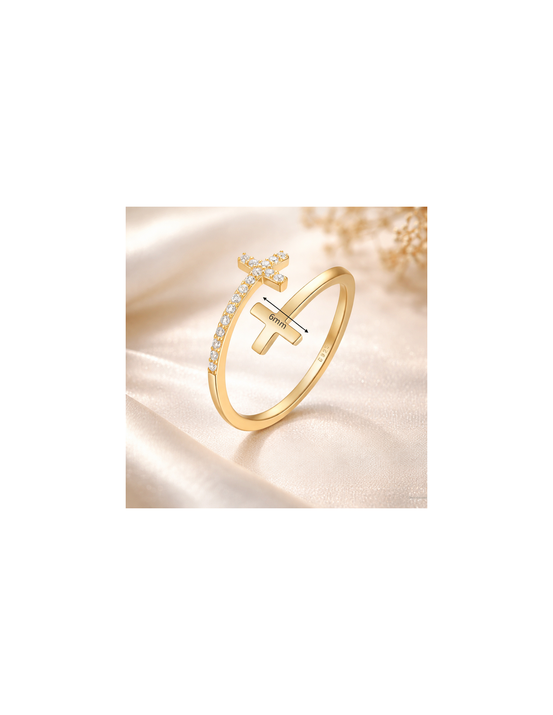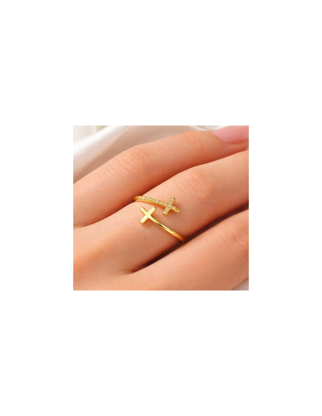 Bague croix double en argent S925 plaqué or – Ajustable avec zircons