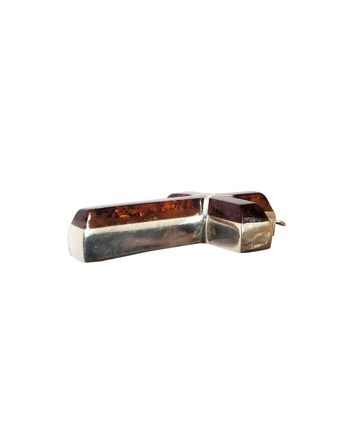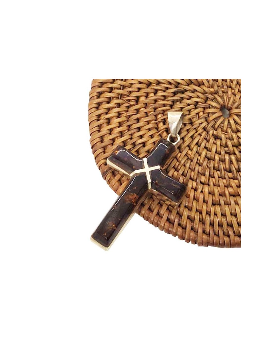 Cette croix en véritable ambre est en argent 925. Le fond en argent met très bien en valeur la pierre naturelle, lui donnant une belle luminosité.