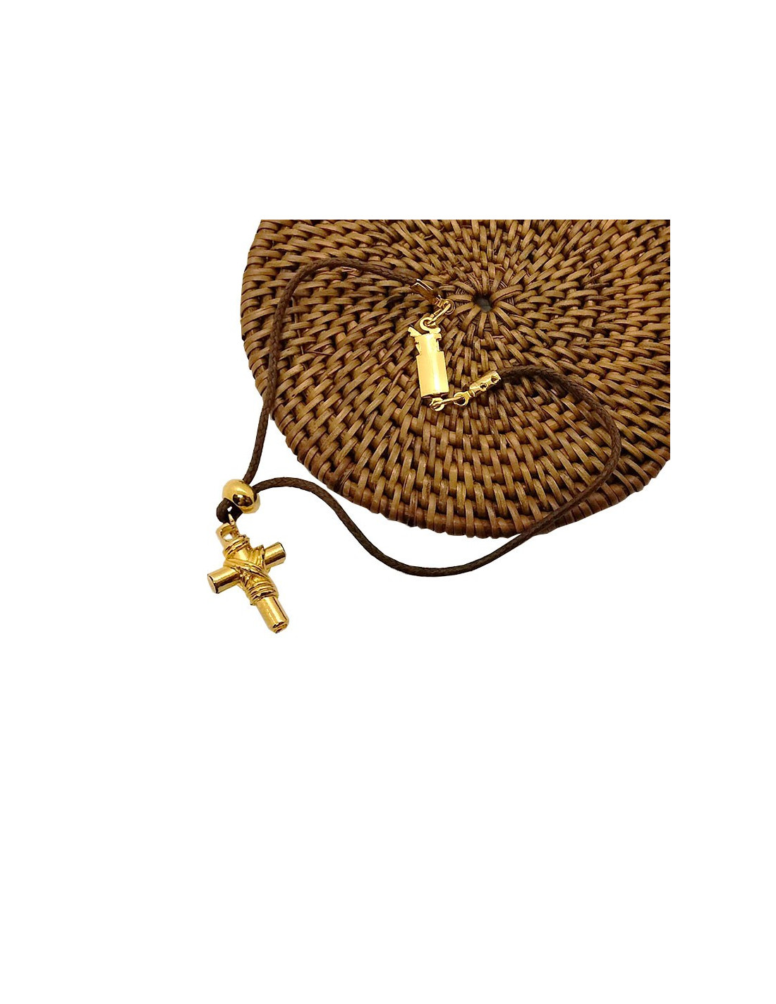 Pendentif en métal doré représentant une croix ficelée, sur un cordon en cuir brun avec un fermoir à levier en métal doré.